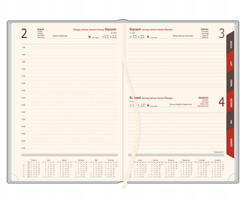 - Календар: 5 мов (PL, EN, DE, RUS, FR), іменини та свята, фази місяця, світанки та заходи сонця, план на весь рік на у нижній частині календаря