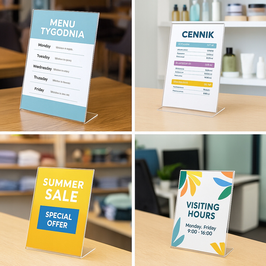 елегантна та практична вертикальна стійка у форматі A5 , виготовленої з прозорого оргскла. Ідеально підходить для представлення окремих інформаційних матеріалів , таких як листівки, прайси, меню, інструкції чи реклама. Завдяки сучасній формі "L" документ відображається під делікатним кутом, який полегшує його читання та привертає увагу клієнтів. Ідеально підходить для офісів, торгових точок, гастрономії, магазинів та прийомів.