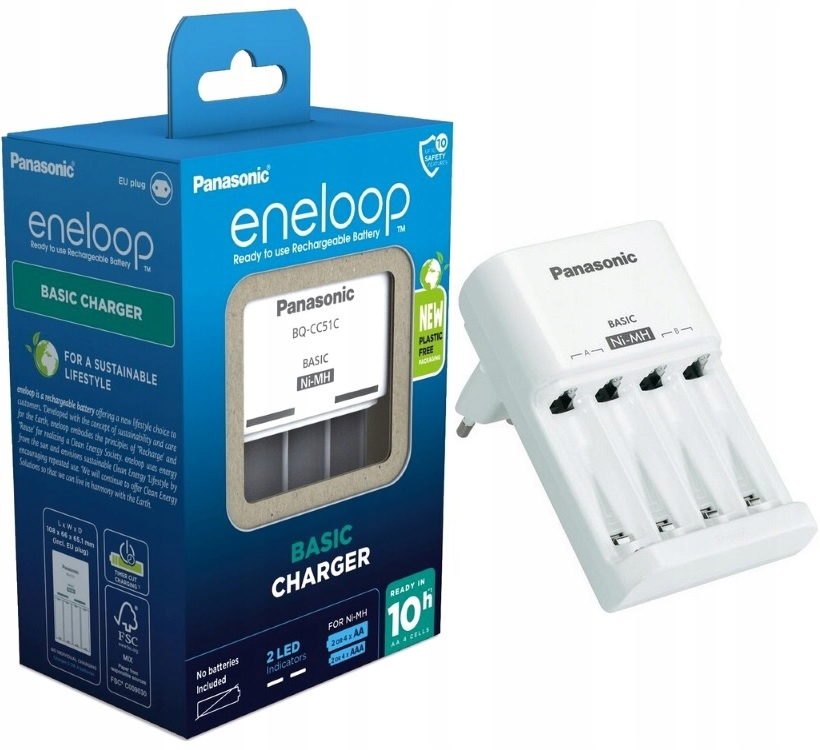 eneloop panasonic зарядний пристрій , призначений для зарядки акумуляторів NIMH R6/AA та R03/AAA, зарядний пристрій підключений безпосередньо до розетки живлення без використання кабелю. Зарядний пристрій має два світлодіоди. Світлодіодні засоби під час зарядки та виходу, коли захисний механізм вимикає зарядний пристрій. До джерела живлення до джерела живлення