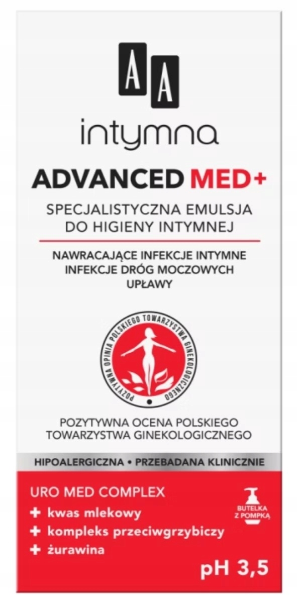Advanced MED+ - Specialized Emulsion for Intimate Hygiene від AA. Емульсія для інтимної гігієни . Рекомендується для щоденної гігієни жінкам, які потребують підтримки у разі повторних інтимних інфекцій, відчуття дискомфорту, спричиненого вагінальними виділеннями, а також як профілактика та підтримка для зменшення симптомів, викликаних інфекціями сечовивідних шляхів. Емульсія має низький pH 3,5, а також містить молочну кислоту, екстракт журавлини, бетаїн, d-пантенол і протигрибковий комплекс. Ефективно відновлює мікробіологічний баланс, знімає подразнення, зменшує відчуття свербежу, нейтралізує неприємні запахи, добре зволожує, заспокоює і знімає роздратування. Емульсію поміщали у флакон (300 мл) з дозуючим насосом.