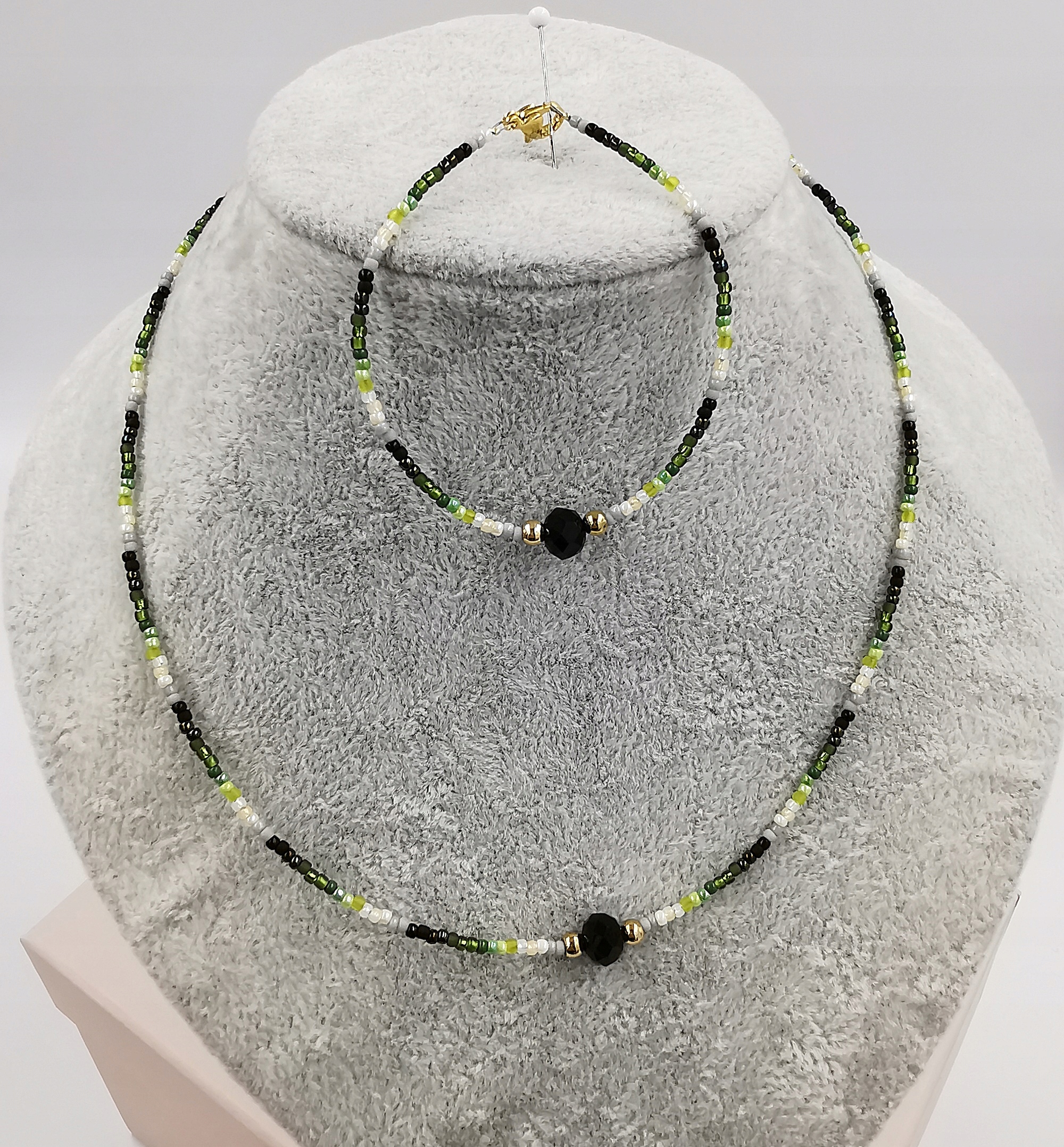 AAA Komplet delikatny ze stali chirurgicznej i koralików zielono-czarnych