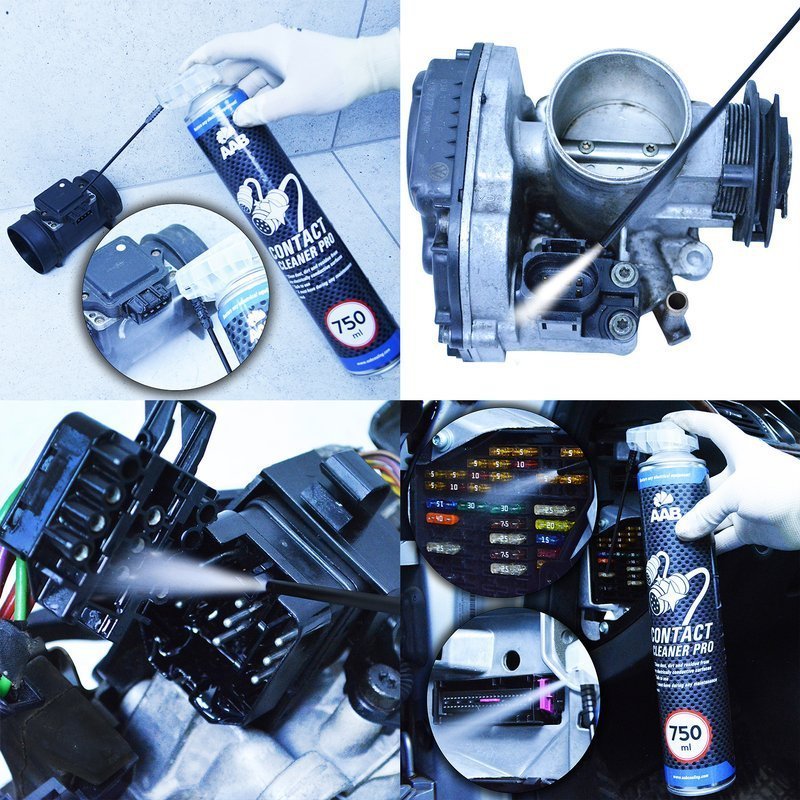 Ви перевіряєте лампочку, і виявляється, що вона справна? Причиною можуть бути забруднені та потьмянілі з'єднувальні кубики, розетки або вилки! З цими елементами відмінно впорається AAB Contact Cleaner PRO. Що робити, якщо ваш автомобіль не запускає двигун після дощової ночі? Знайдіть свічки запалювання або клеми акумулятора та позбудьтеся від різного роду відкладень та корозії за допомогою нашого продукту! Ви ефективно покращите провідність котушки запалювання за допомогою свічки запалювання та підключення клем акумулятора!