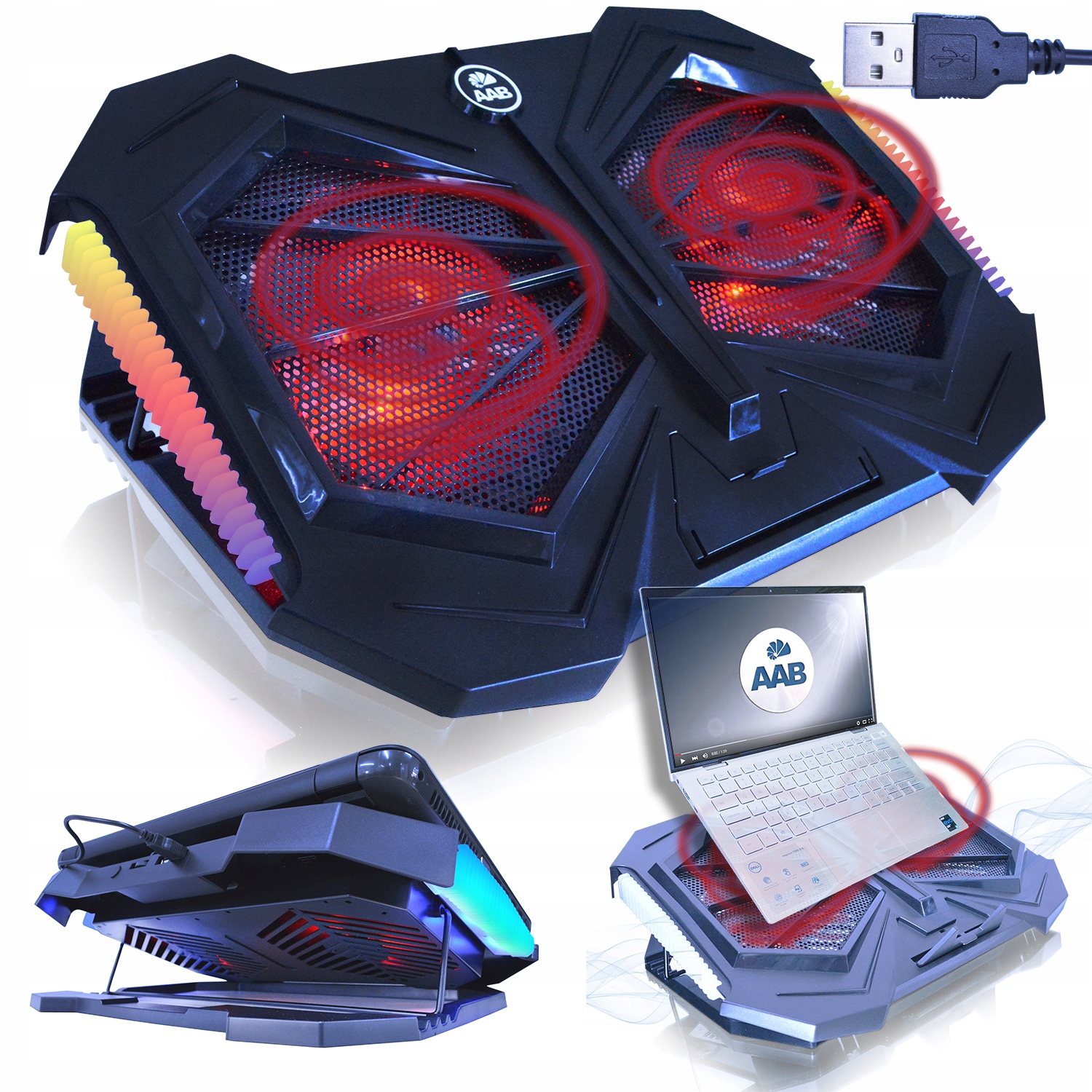 Простий у використанні та легкому встановленні. Покладіть ноутбук на планшет і підключіть кабель USB до порту USB. Поверніть ручку регулятора вправо, щоб запустити вентилятори. Ручка розташована на задній частині підставки біля портів USB. Додатковою перевагою є додатковий порт USB в підставці, до якого можна підключити додаткове обладнання, наприклад, мишку або флеш-накопичувач. Кнопка поруч із ручним контролером швидкості дозволяє керувати світлодіодним підсвічуванням RGB (утримуючи кнопку протягом 3 секунд, вмикається/вимикається підсвічування збоку RGB)