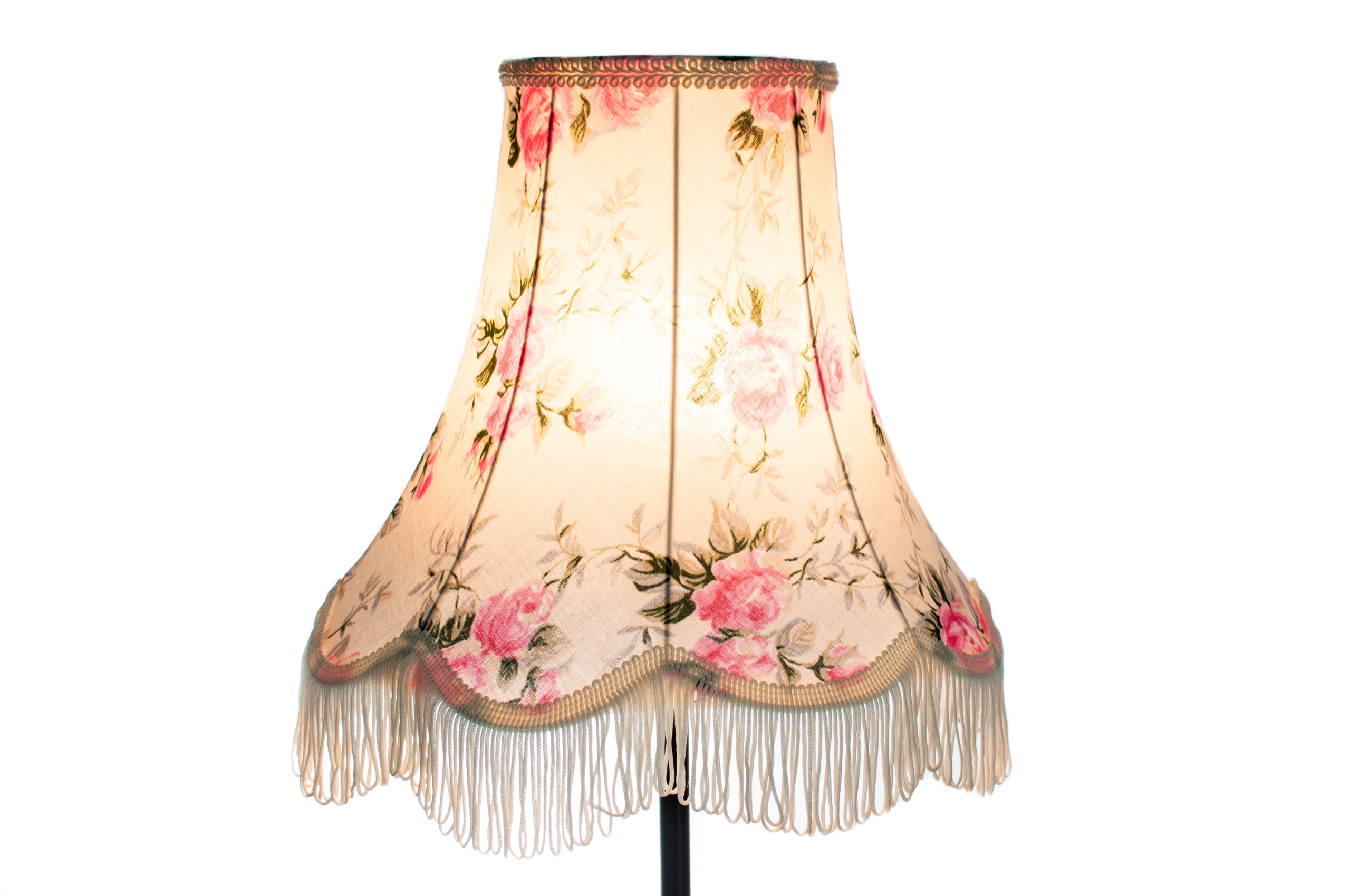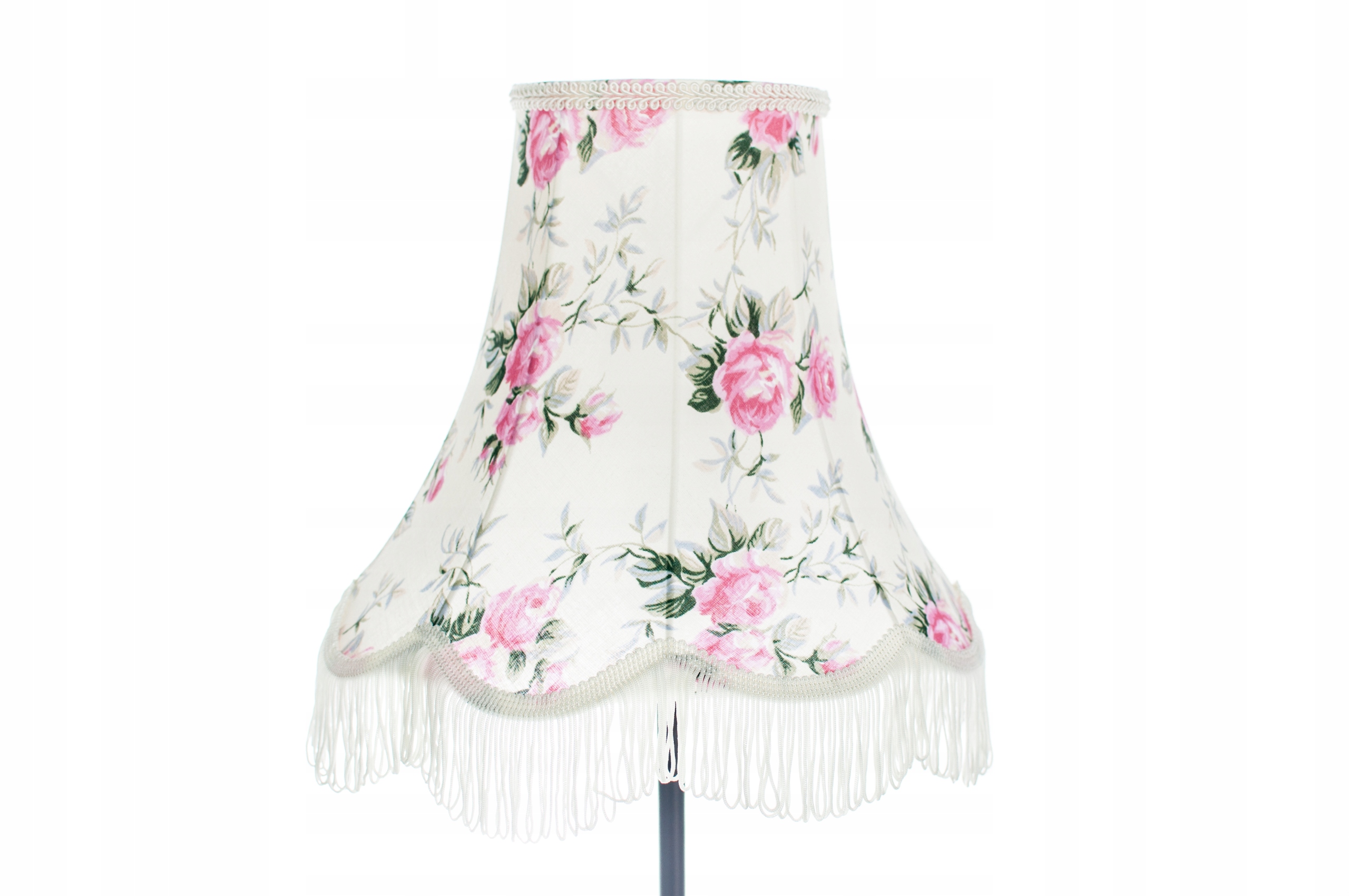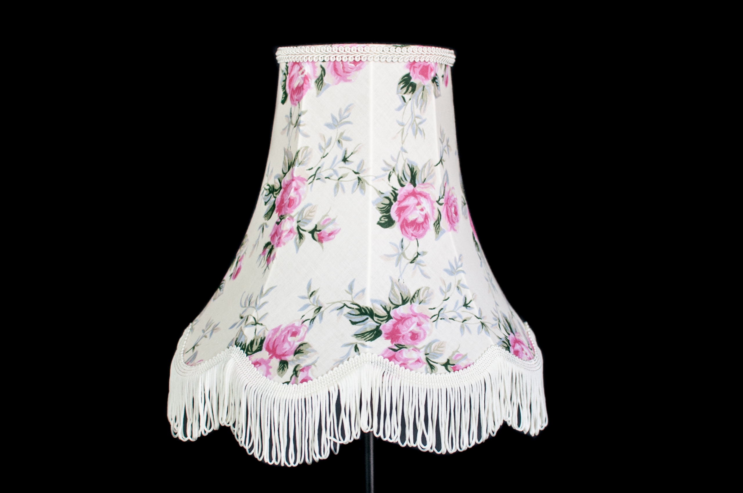 Абажур виготовлений з бавовняної тканини кремового кольору, прикрашений трояндами.