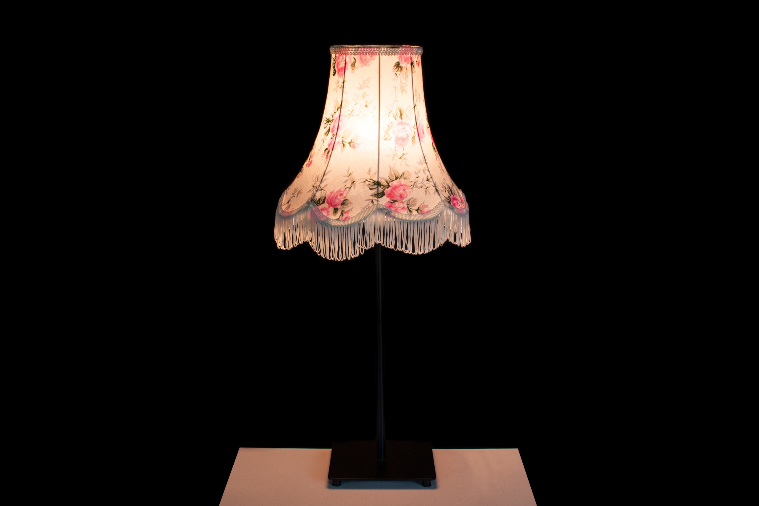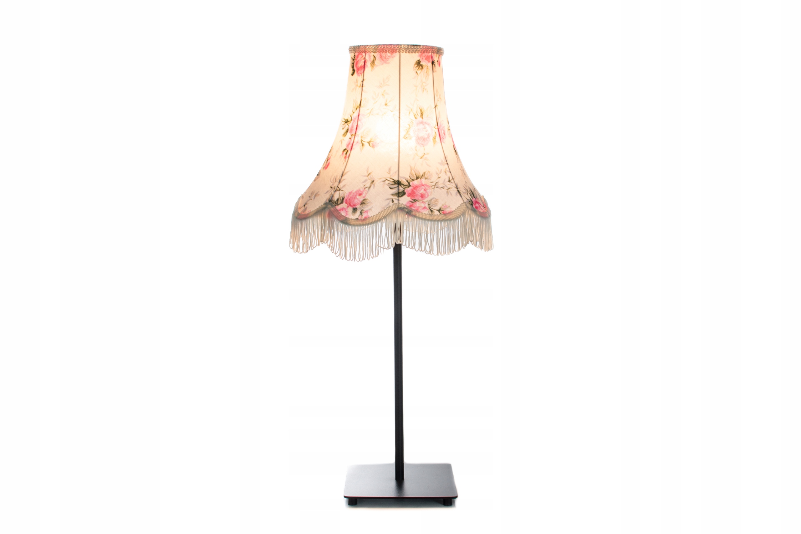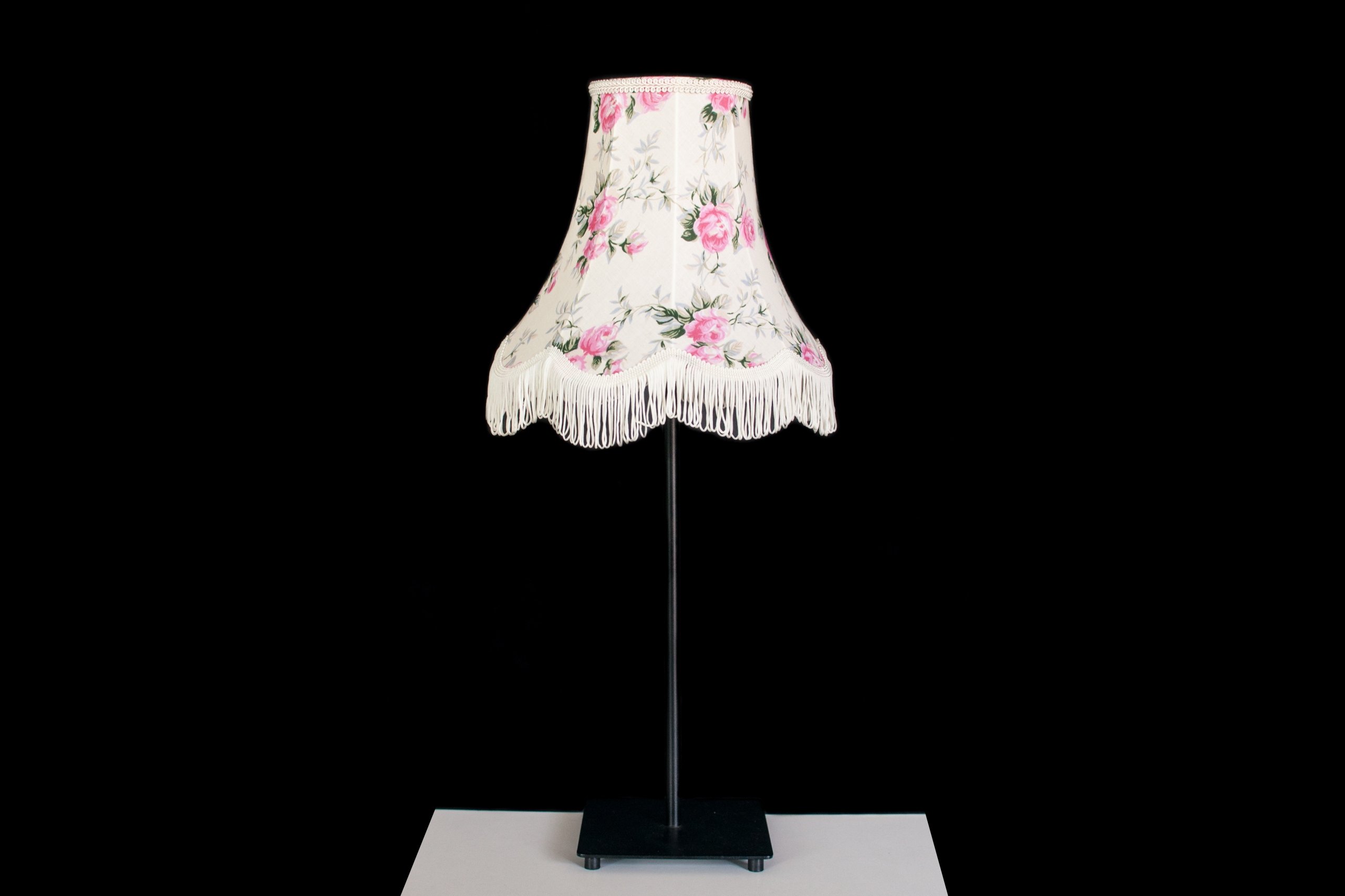 Абажур виготовлений з бавовняної тканини кремового кольору, прикрашений трояндами.