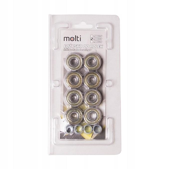 ABEC-7 MOLTI — це підшипники, виготовлені з високоякісної вуглецевої сталі, що забезпечує відмінну твердість і довговічність. Він характеризується низьким опором коченню, що означає вищу швидкість відповідно до стандарту ABEC Американського комітету з розробки кільцевих підшипників. Важливим параметром цього підшипника є ексцентриситет, тобто округлість на доріжці у внутрішньому кільці, і становить всього 0,0025 мм. Підшипник призначений для роликових ковзанів, скейтбордів і самокатів.