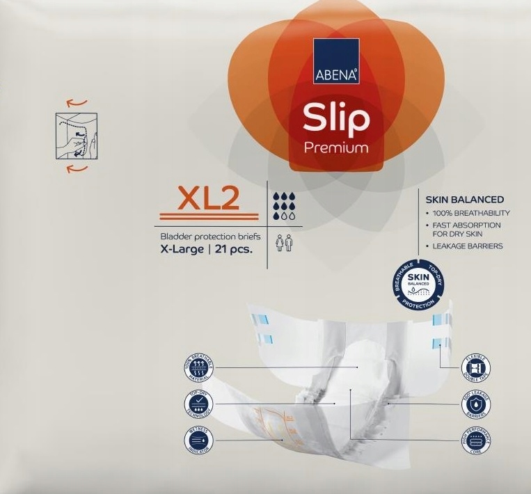 Abena Slip - це наша преміальна лінія, яка повністю дихаюча, анатомічно форма захисних підгузників , призначена для людей з нетриманням сечі/калу з середньою до важкої інтенсивності. Надзвичайно ефективне ядро з технологією верхньої сухи забезпечує швидке поглинання та суху поверхню навіть після багатьох дефекацій.