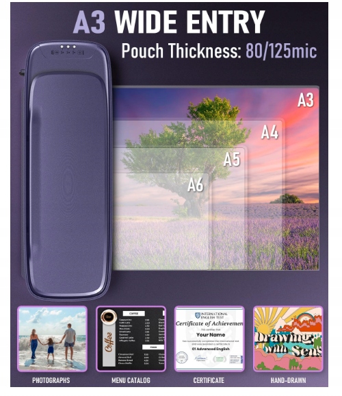 - Швидке ламінування без бульбашок повітря: на відміну від повільніших ламінаторів, сприйнятливих до бульбашок, Laminator Ablemark прискорює весь процес завдяки швидкій швидкісній транспортній системі подвійного ролика. Завдяки ламінуючій швидкості 370 мм/хв на 50% швидше, ніж подібні продукти, що дозволяє ламінувати документ за кілька секунд. У той же час ви можете ламінувати вдвічі більше документів, ніж інші машини. Крім того, технологія ламінування Ablemark без повітряних бульбашок забезпечує бездоганні результати щоразу, завдяки якому ваші важливі документи та сімейні фотографії виглядають настільки ж вишуканою, як і твори мистецтва.