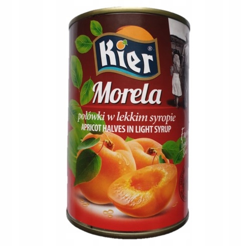 Абрикос у вигляді очищених половинок в сиропі в упаковці 410 г (240 г після відціджування) від Kier.