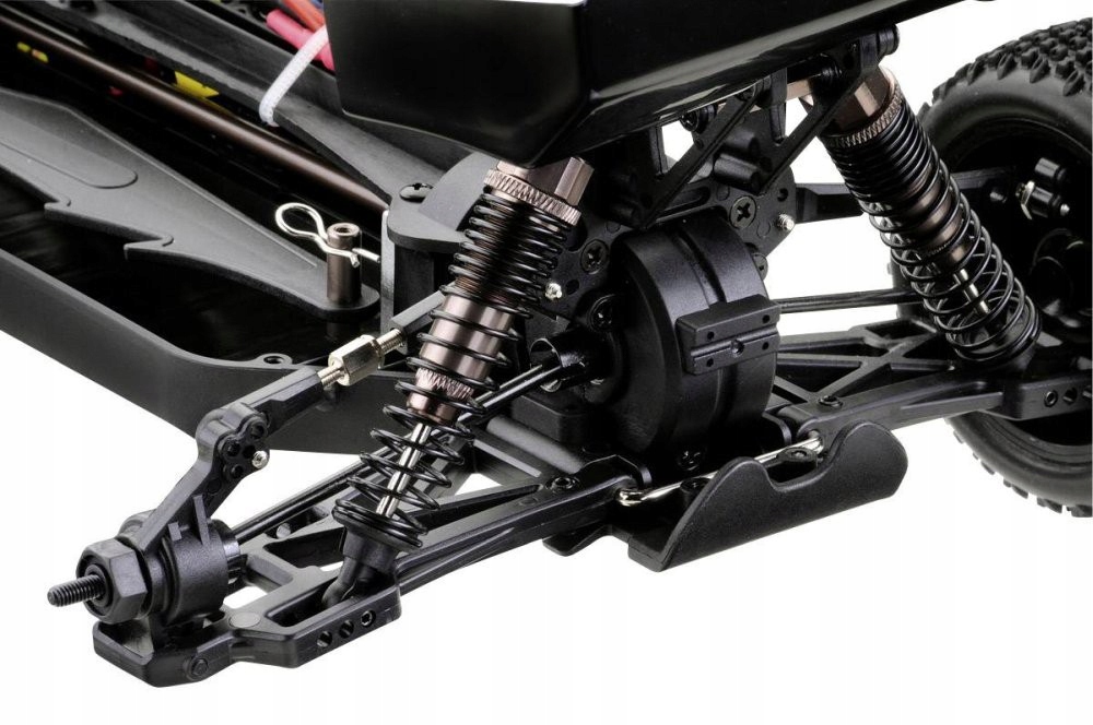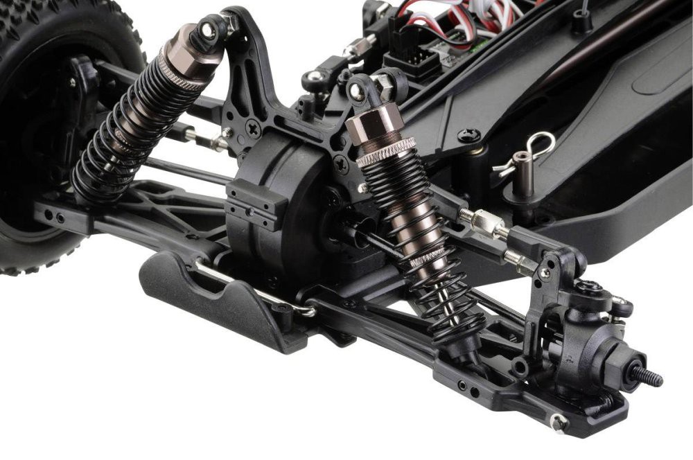 Повний привід забезпечує тягу, необхідну для маневрування в найскладнішій місцевості, а регулятор з можливістю руху вперед або назад дозволяє долати вузькі маршрути. Легке пластикове шасі, чотири маслонаповнені регульовані амортизатори та незалежна підвіска забезпечують надійну роботу.