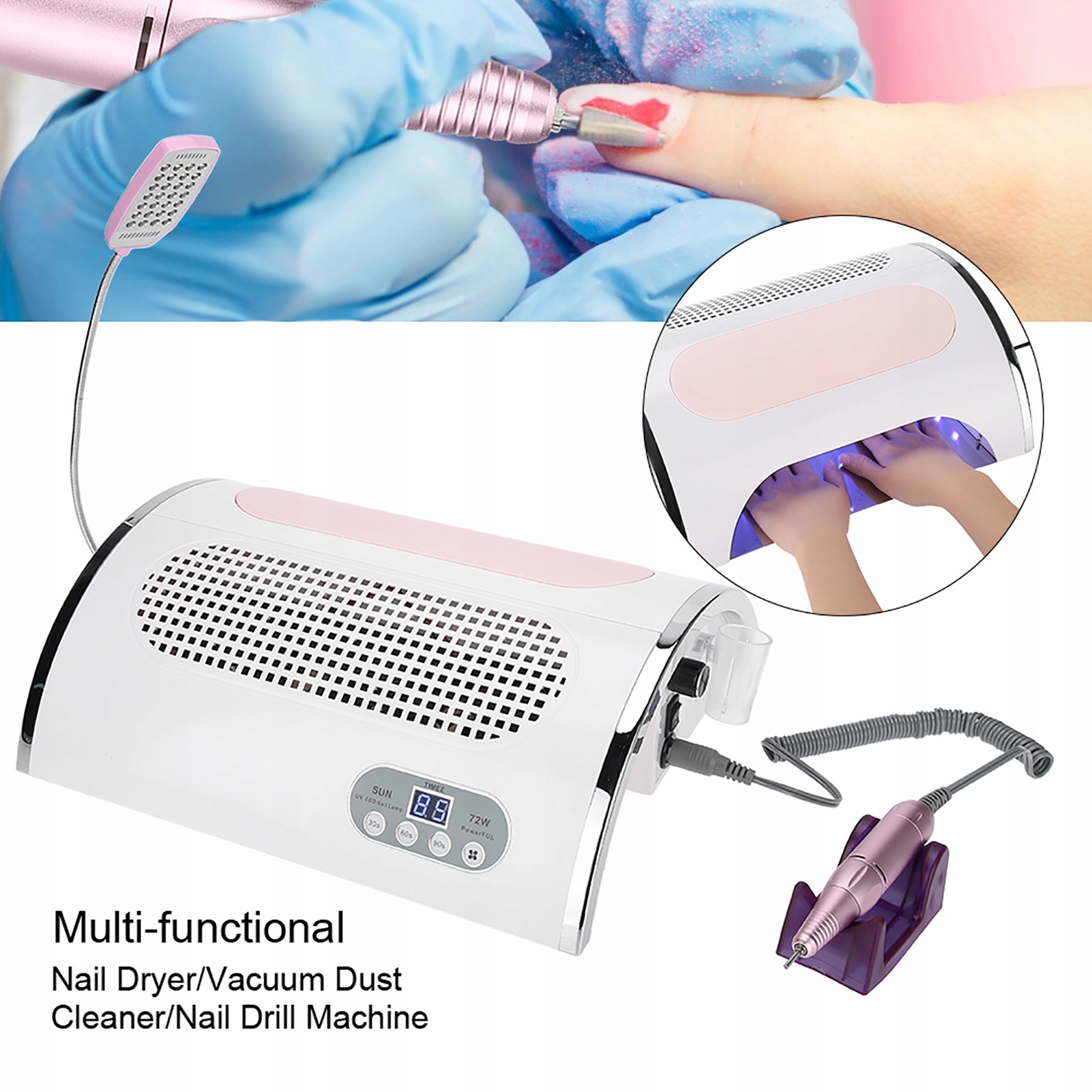 Ідеальний набір інструментів для прикраси нігтів! Ця машина може бути використана для полірування нігтів, збирання пилу, сушіння нігтів, освітлення, зарядки мобільного телефону, дуже практичного для використання. Він ідеально підходить як для професійного використання у вітальні, так і для початківців вдома чи вітальні, що забезпечує приємний досвід прикраси нігтів.