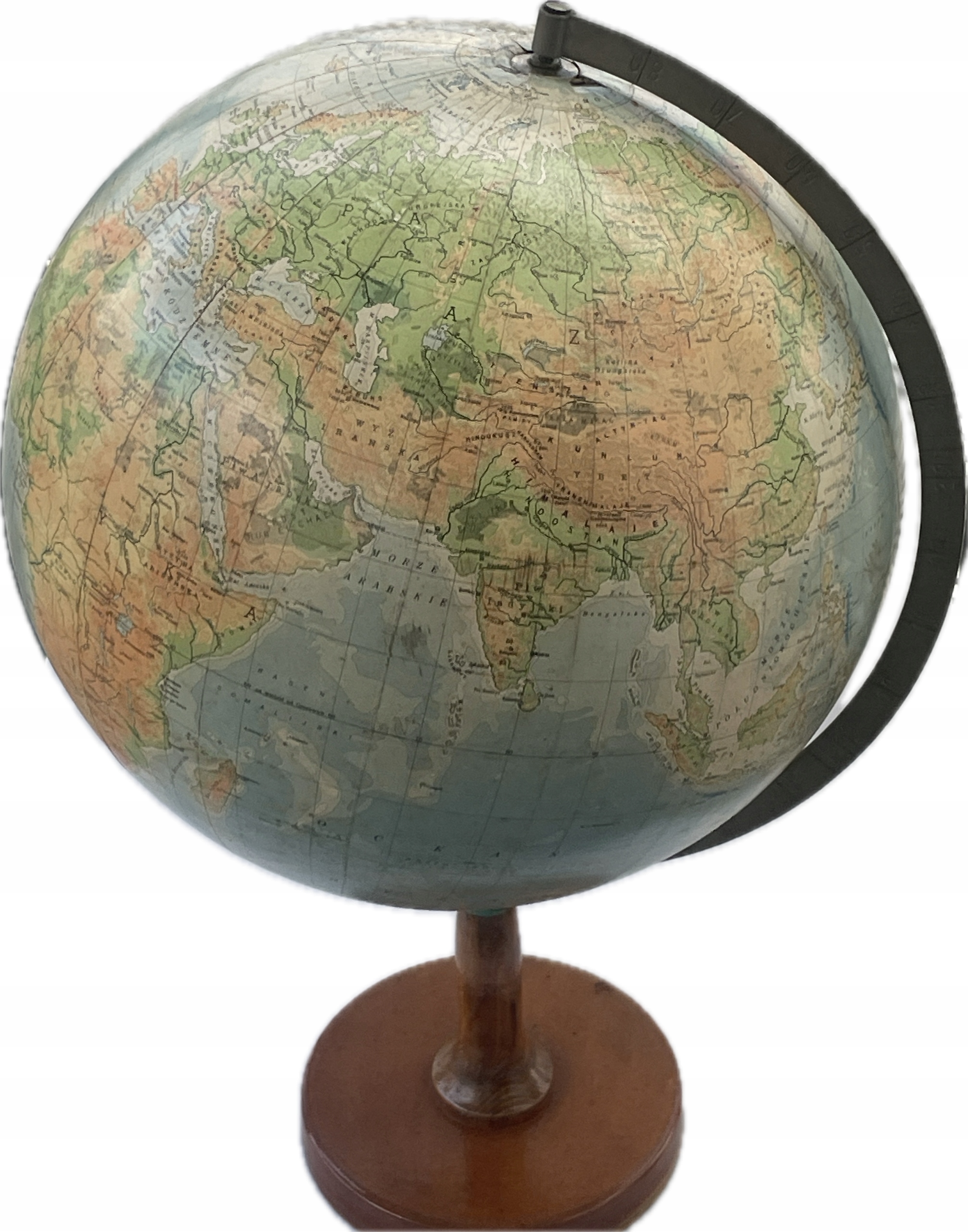 Стан видно на фотографіях, глобус змінив колір і тріщина вгорі біля входу гвинта, видно на фотографіях. Він не має серйозних дефектів, гвинт трохи ослаблений. Основа дерев’яна, алюмінієва дуга глобуса зі шкалою дуже міцно зроблена.Глобус дуже важкий і важить 4463 кг