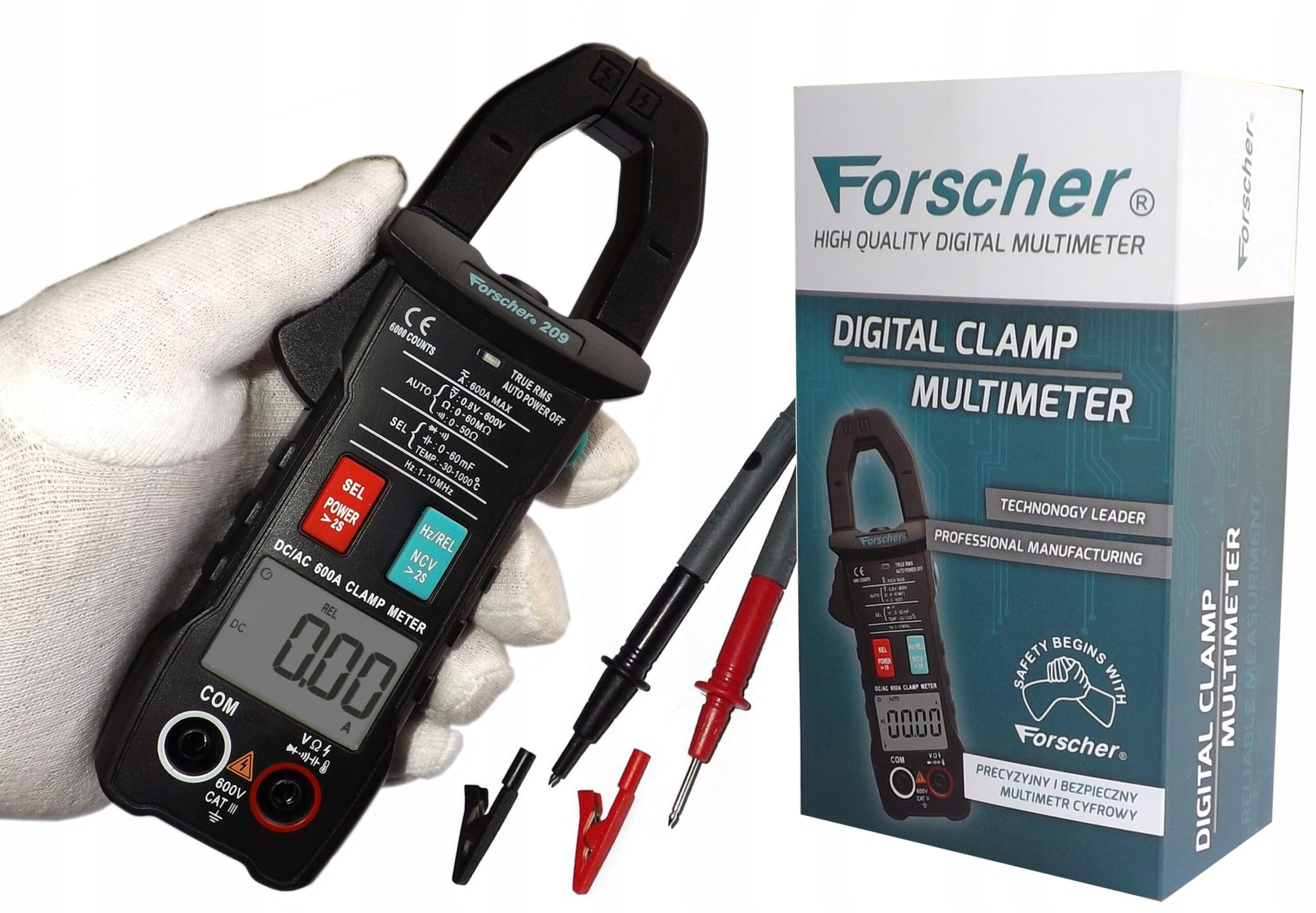 Forscher FS209 – це інноваційна конструкція невеликих розмірів (легко поміщається в кишені брюк). Лічильник сам інтелектуально перемикає функції вимірювання. Завдяки цьому експлуатація дуже проста і немає можливості пошкодити лічильник через неправильне підключення. Підключаємо мультиметр до джерела живлення і зчитуємо вимірювання вольтметра - потім замикаємо щупи і чуємо сигнал тестера прозвонки (зумер), немає необхідності перемикатися між вольтметром і тестером прозвонки або вимірюванням опору - це робить вимірювач негайно, розумно вибираючи функцію та діапазон вимірювання.