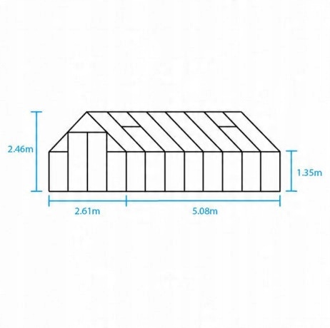 Теплиці повністю виготовлені з алюмінію, заповненого загартованим склом товщиною 3 мм. Інтегровані жолоби та розсувні двері, що легко відкриваються, є стандартними, а 4 вікна, що відкидаються, забезпечують постійний повітрообмін.