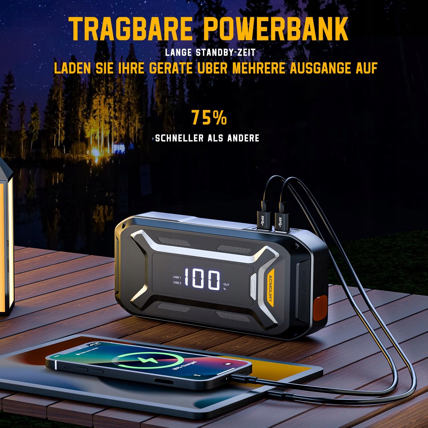 Acmount Powerbank для аварійного запуску, 5000A пікова підсилювача для аварійного запуску автомобіля для пасажирських автомобілів (для всіх бензину/ 10,0 л), 12В-стрибковим стартером з РК-дисплеєм, швидка зарядка USB, світлодіодне світло H1> - Кілька секунд (для всіх газових двигунів та 10-літрового дизельного). Навіть якщо напруга акумулятора занадто низька, автомобіль буде змушений перезапустити після натискання кнопки "Boost". До 60 аварійних стартів починається з повного заряду, що підходить для всіх транспортних засобів на 12 В, включаючи мотоцикли, пікапи, мотоцикли, трактори, вантажівки, фургони, транспортні засоби, яхти тощо. Зарядка смартфона, планшета чи інших електронних пристроїв USB. Коробка аварійного запуску ACMount P120 оснащена двома результатами USB (одна з них підтримує швидку зарядку) та USB -тип C (5 В/3 а) порту зарядки, який може зарядитись одночасно і на 50% швидше, ніж стандартні зарядні пристрої.