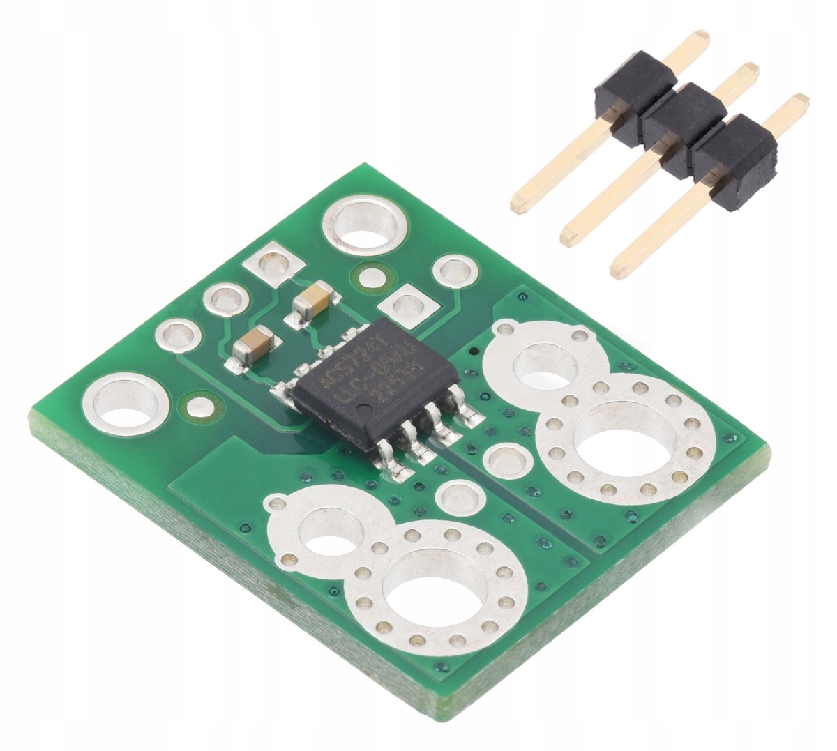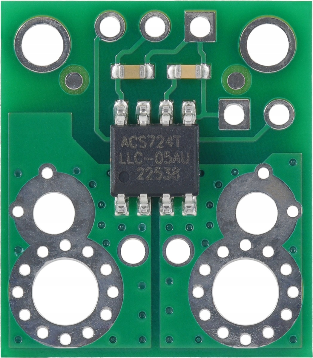 Модуль з односпрямованим датчиком струму Холла на основі системи ACS724LLCTR-05AU. Він дозволяє вимірювати струм в діапазоні від 0 до 5 А. Плата живиться від напруги від 4,5 В до 5,5 В і призначена для використання в схемах з логічною напругою 5 В. Вона пропонує низький опір струму (~1,2 мОм) і електричну ізоляцію до 2,4 кВ RMS. На виході виводиться пропорційна аналогова напруга (800 мВ/А) зі зміщенням 0,5 В і похибкою ±0,9%.