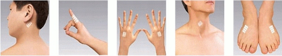 Приклади накладення пластирів за вухом, на пальці, на руках, на шиї та на ногах.