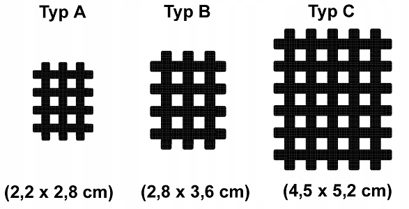 Стрічка доступна в трьох розмірах (типах). Тип А (найменший розмір) призначений для дітей або зони обличчя, його можна використовувати довше в місцях, де шкіра піддається сильному розтягуванню. Тип B (середній) і C (найбільший розмір) призначені для більших ділянок тіла, які менше піддаються розтягуванню, наприклад, зовнішня поверхня стегон, рук, ніг тощо.