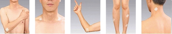 Приклади накладення пластирів за вухом, на пальці, на руках, на шиї та на ногах.