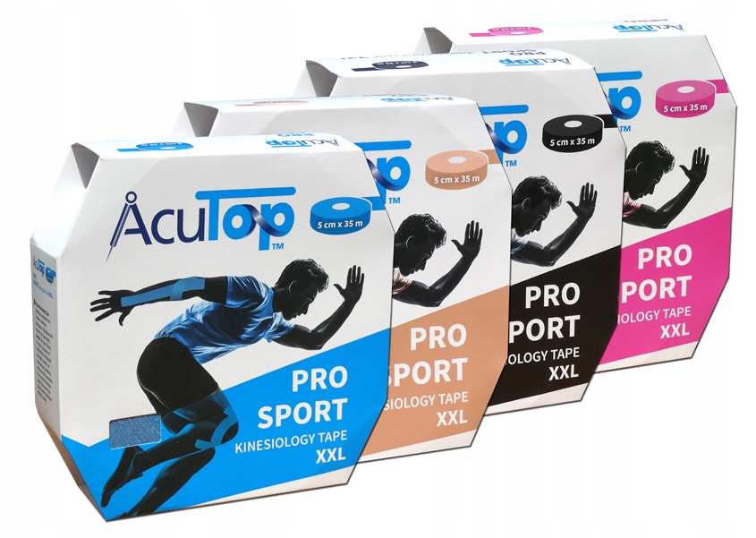 Стрічки AcuTop ProSport мають унікальний хвилеподібний спосіб нанесення клею, який став стандартом у сфері терапевтичного тейпування. Вони забезпечують неінвазивний та ефективний метод відновлення нервово-м’язової системи, одночасно покращуючи крово- та лімфообіг, заспокоюючи біль і забезпечуючи комфорт і стабілізацію, необхідні під час терапії пацієнта. Ширина 5 см дозволяє вирізати більшість аплікацій. Його можна легко використовувати для всіх чотирьох найпопулярніших методів кінезіотейпування (у формі літери «I», «Y», «X», «F»). Ця стрічка ідеально підходить для використання на всьому тілі, а її довжина 35 м дозволяє застосовувати її багаторазово.