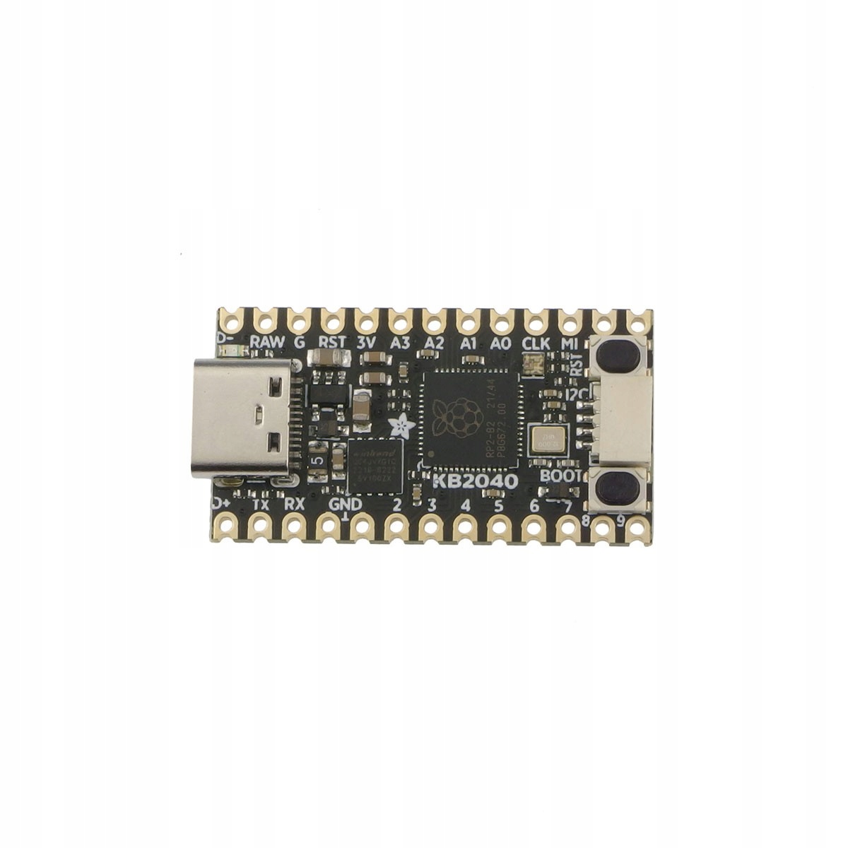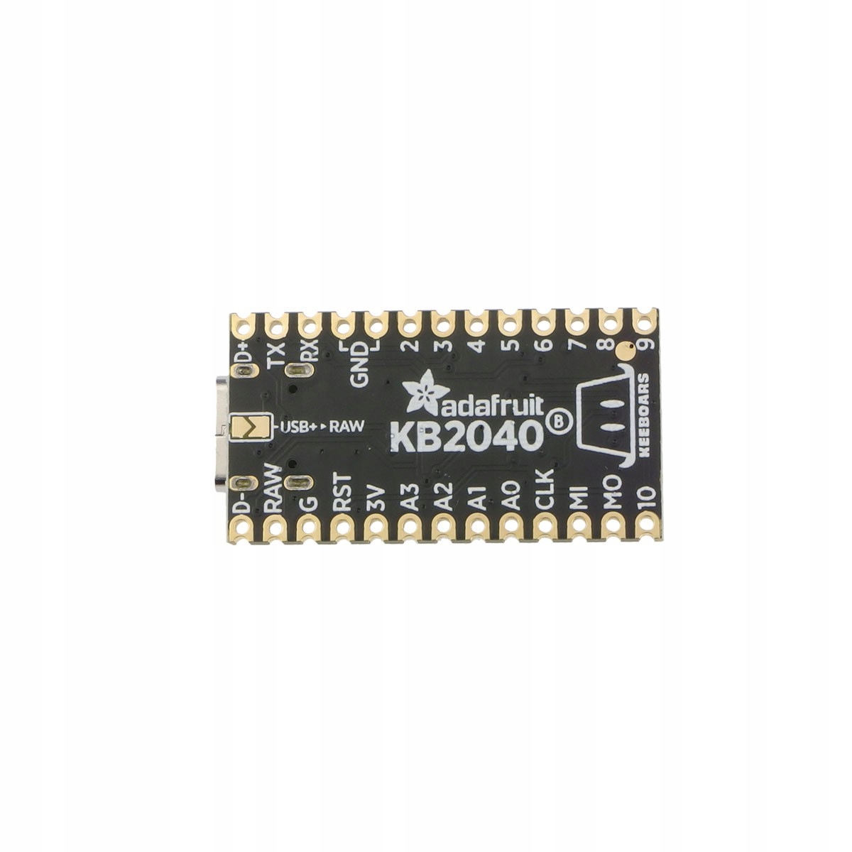 Adafruit KB2040 - це плитка, оснащена мікроконтролером RP2040, розробленим фондом Raspberry Pi. Система має дві ядра Cortex M0+, що працюють з частотою до 133 МГц, 264 кб оперативної пам’яті та 30 портів GPIO. Мікроконтролер не оснащений флеш -пам'яттю, але пластина має зовнішню пам'ять потужністю 8 Мб, підключеного за допомогою інтерфейсу QSPI. Потужність модуля та програмування та 20 випусків GPIO, на яких виводяться периферії, такі як чотири 12-бітні входи АЦП, виходи ШІМ, два інтерфейси I2C, SPI та UART. Плитка оснащена з'єднувачем QT STEMMA та двома прокладками (D+, D-) USB-інтерфейсом. Платформа підтримує популярні мови програмування мікропітонів, CircuitPython та C/C ++. Програми можна завантажити в пам'ять за допомогою інтерфейсу USB за допомогою вбудованого завантажувача. SRAM