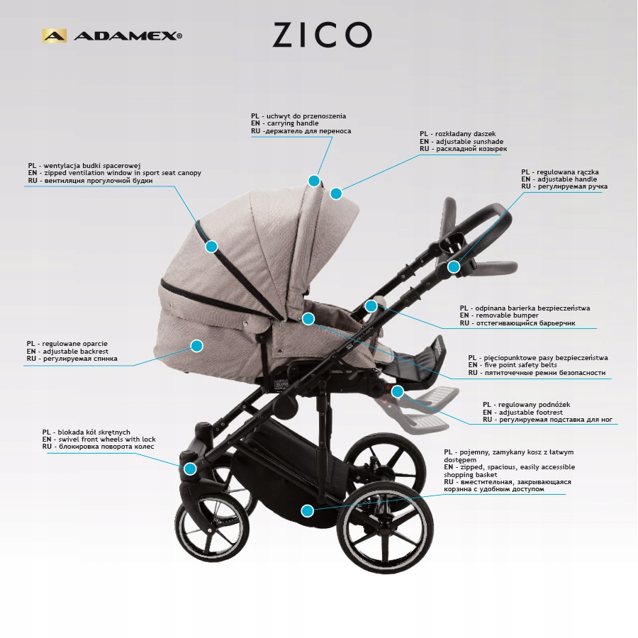 Zico Adamex був створений для користувачів мобільних пристроїв, які цінують практичні рішення. Ультра -світла гондола (лише 4 кг) дозволяє складати його "плоскою". Міцна рамка візки легко складається і займає мало місця в багажнику вашого автомобіля. Гондола та пішохідне сидіння оснащені великим, складним козирком.