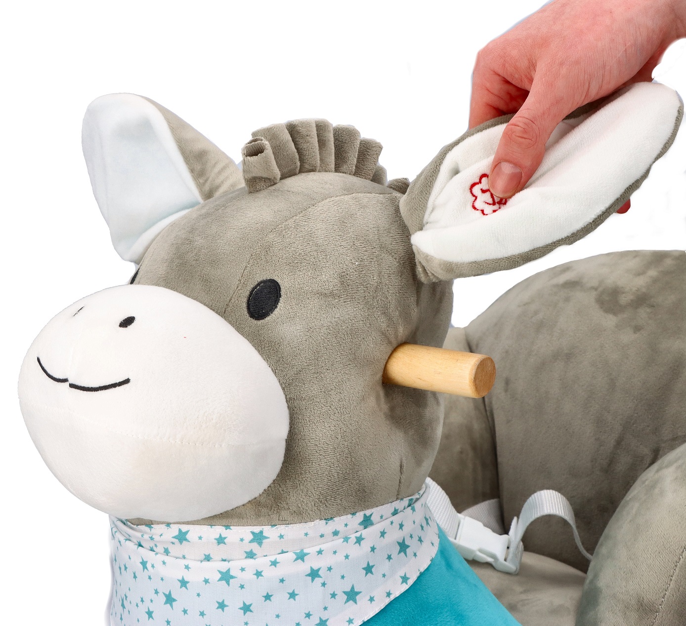 Ослик виготовлений з приємного і ніжного на дотик плюшевого матеріалу. Полози та тримачі ручок виготовлені зі світлого дерева. Весь витриманий в ніжних, приємних кольорах, які підходять як хлопчикам, так і дівчаткам. Білий шарф з синіми зірочками виглядає чудово і додає шарму нашому кріслу-гойдалці.