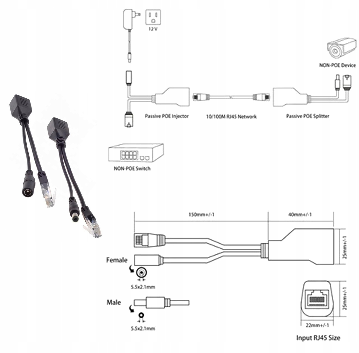 ✅ Набір двох адаптерів POE з роз'ємами RJ45 та DC 2.1/5.5. Передача TCP -IP та джерело живлення з однією Ethernet Twisted PARY -8. p>