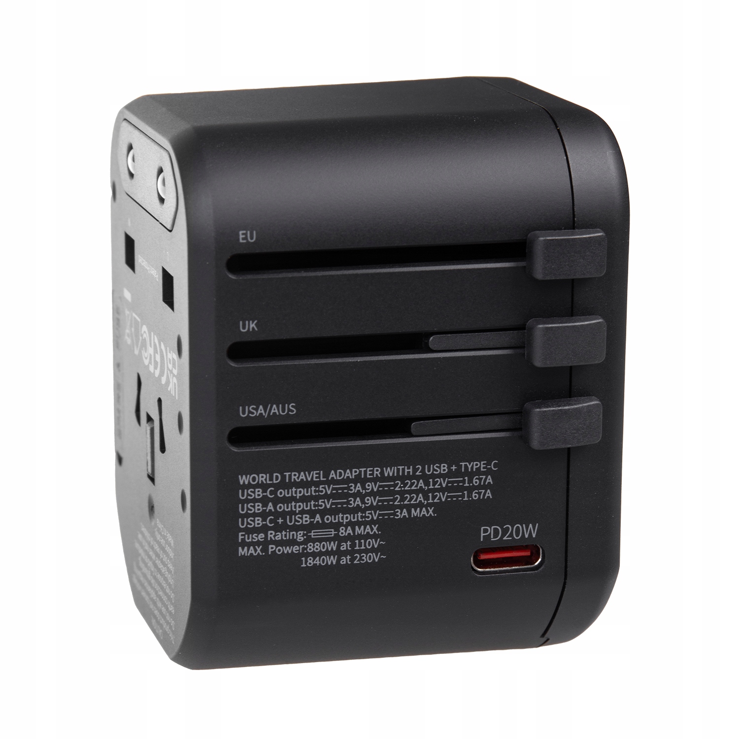 Адаптер для подорожей з практичною 8-кляляньною розеткою та вбудованою штекерою Великобританії/Eu/Au/US. Ви можете використовувати його в 200 країнах під час канікул або подорожей. Ви можете заряджати свої мобільні пристрої, такі як смартфон, PowerBank, планшет, КПК, iPod, MP3 майже у всьому світі. Загальна потужність максимум. 3a.