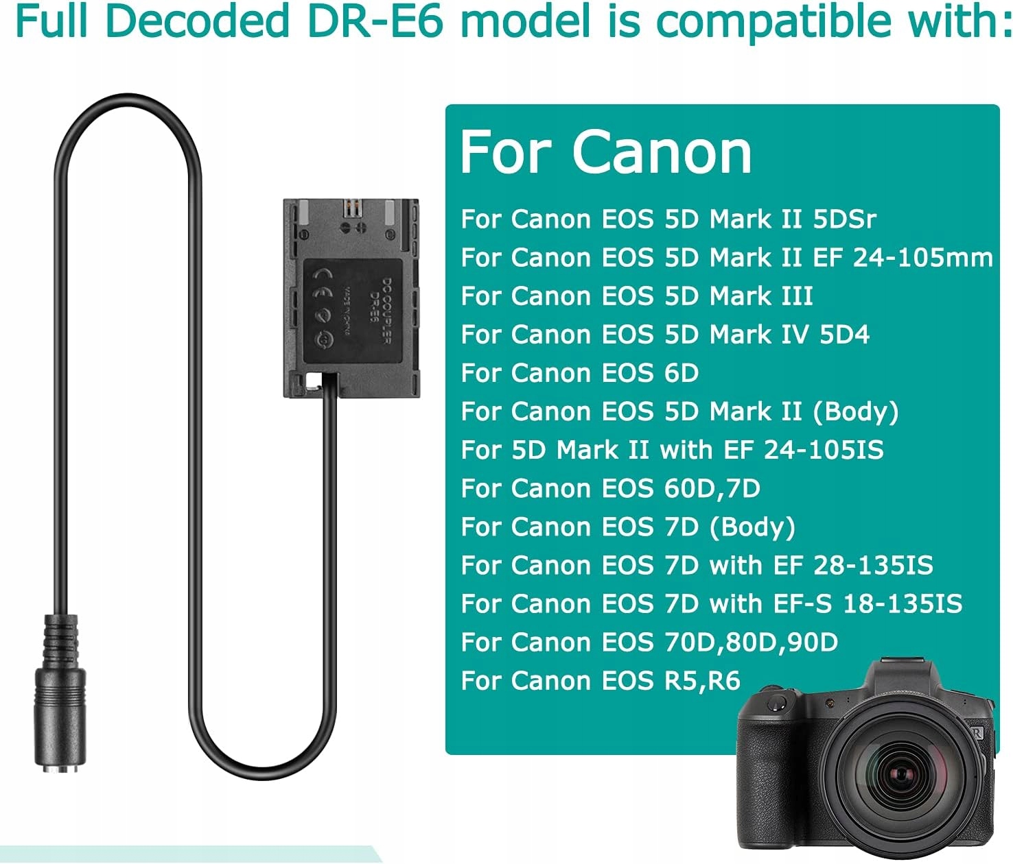 - ★ Сумісний з: Canon EOS-A EOS R5, EOS-R6, EOS 90D, EOS 80D, EOS 70D, EOS 60D, EOS 6D EOS 6D MARK II, 7D, 7D MARK 2 EOS 5DS EOS 5DS A EOS 5D 2, 5D MARK 3, 5D MARK 4.
