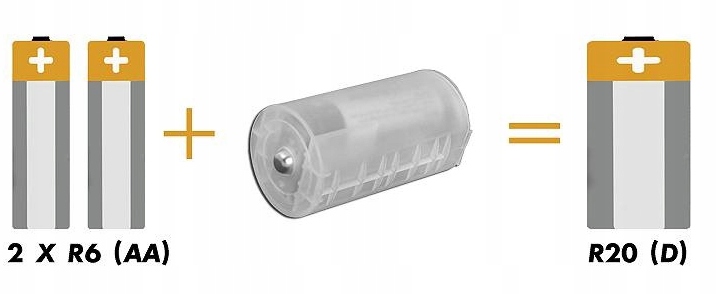 Адаптер дозволяє використовувати батареї R6 (AA) і акумулятори замість R20 (D). Сумісний з усіма батарейками/акумуляторами R6 (AA).