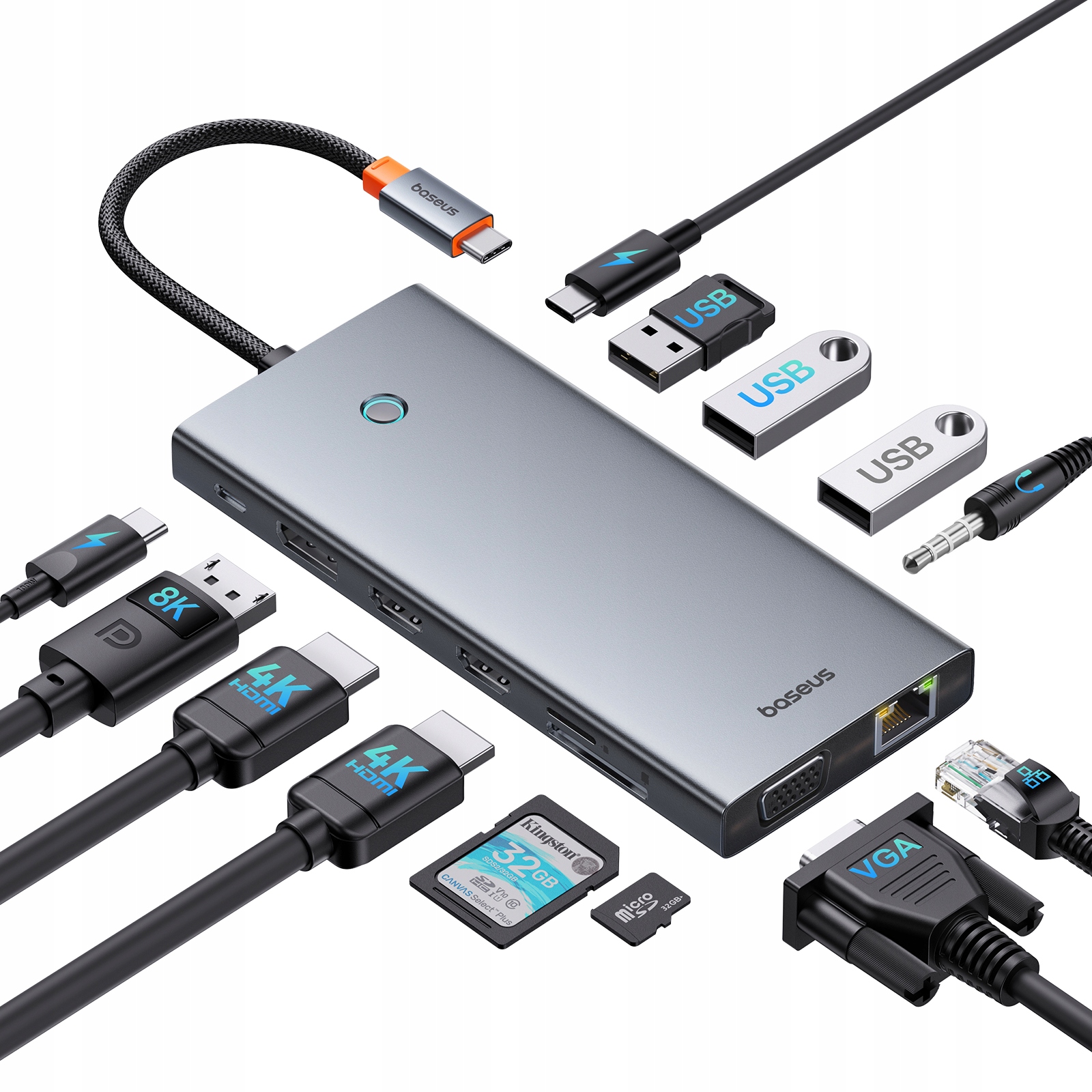 Адаптер Baseus Hub USB-C 13 HDMI, DP, VGA, USB3.1, RJ45, SF/TF, AUX