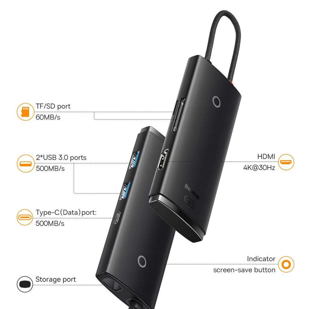Функціональний аксесуар від бренду Baseus, який легко розширить можливості вашого пристрою на 6 додаткових портів. Цей багатофункціональний пристрій забезпечує швидку синхронізацію даних, заряджання пристроїв і можливість відображення на великому екрані, наприклад телевізорі чи проекторі.