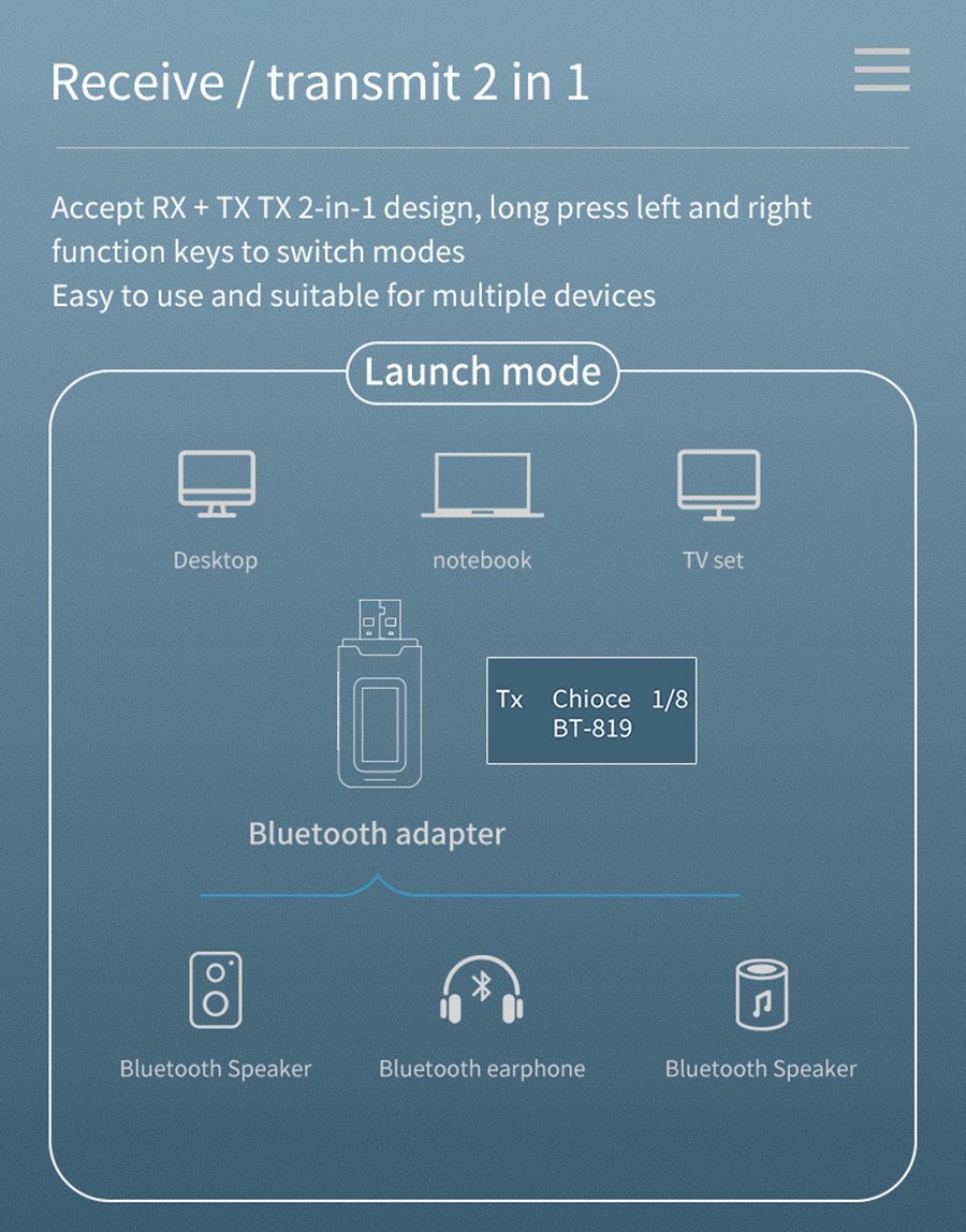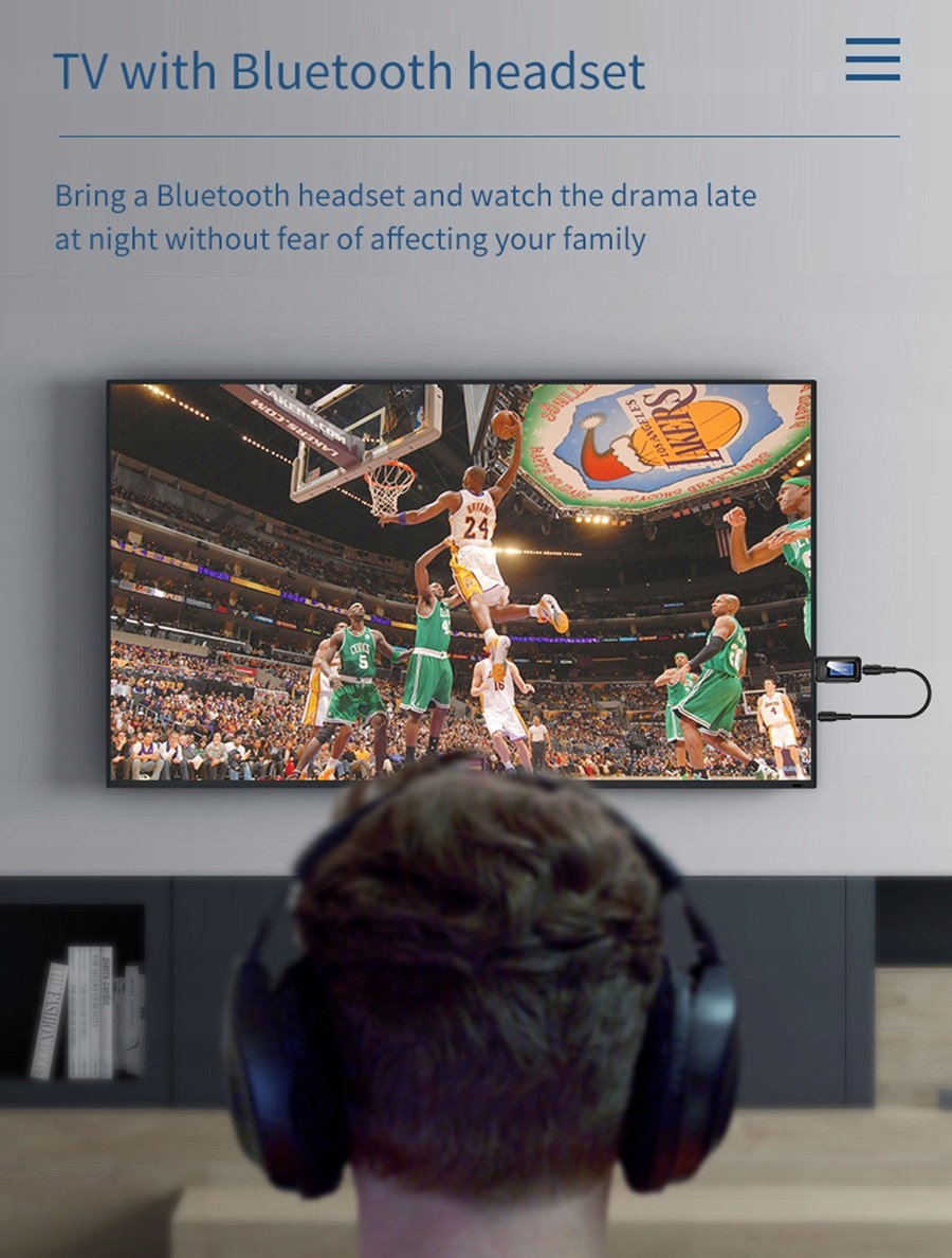 Використовується для передачі бездротового аудіосигналу на навушники чи інший приймач Bluetooth. Джерело аудіо слід під’єднати до адаптера за допомогою допоміжного кабелю з міні-роз’ємом 3,5 мм.