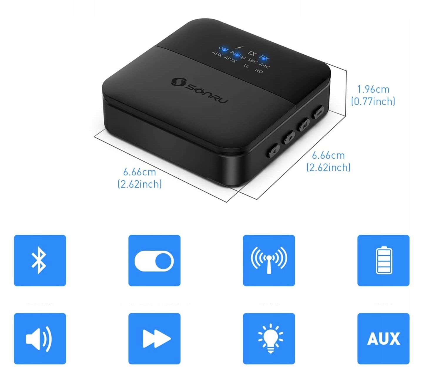 ✅ ✅ кнопки світлодіодів та управління: 11 світлодіодні індикатори, що вказують, який статус використовує Bluetooth. Режим RX: Клацніть попередню/наступну кнопку пісні, збільшуйте/зменшуйте гучність, натиснувши, відтворюючи/призупиняючи музику за допомогою адаптера Bluetooth. Режим TX: замовчування або відновлення, поверніть назад пристрій, двічі клацніть, щоб швидко регулювати стан. (Примітка: пристрій переходить у режим сну через 6 хвилин у нездоровому стані.)