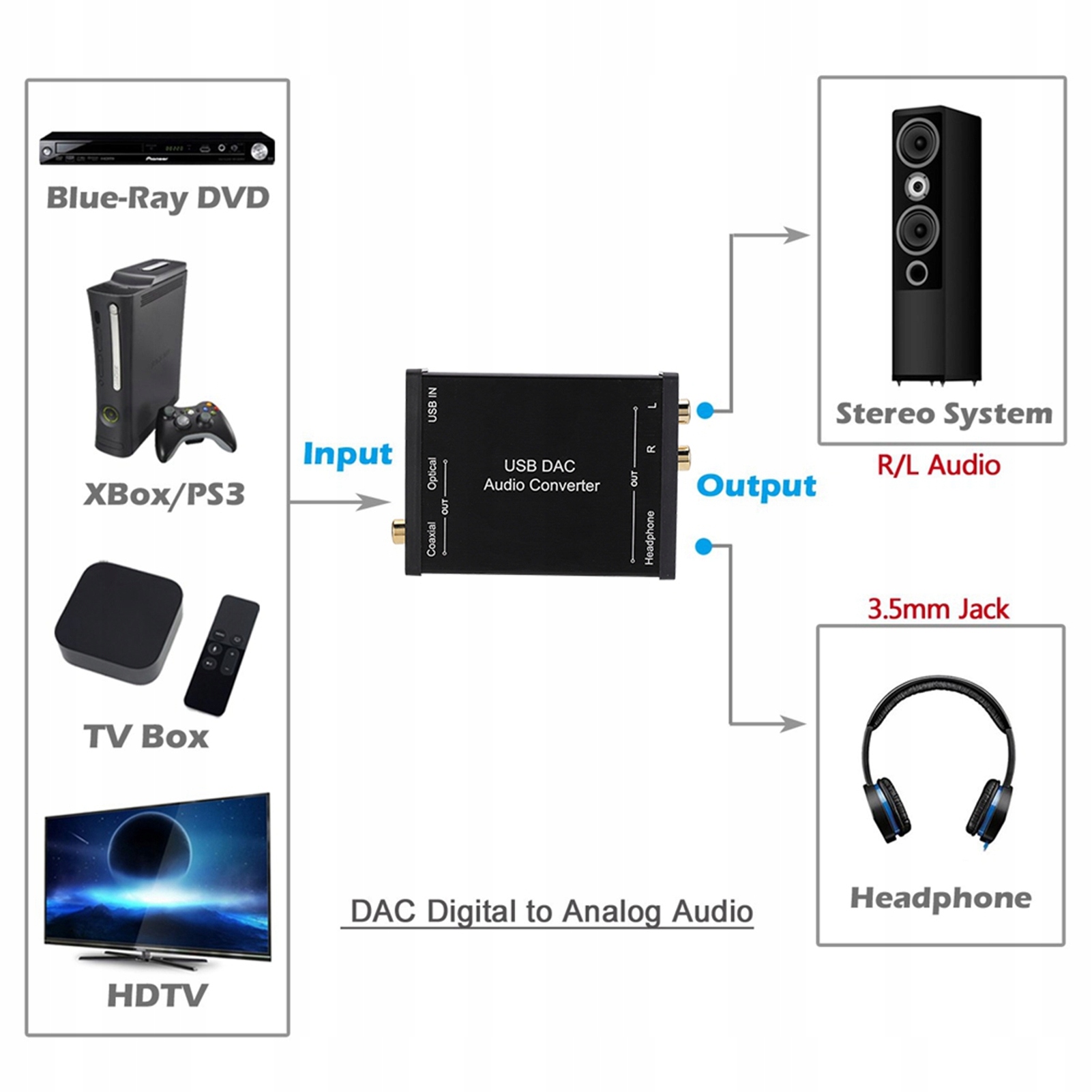Аудіо перетворювач USB DAC має аналоговий вихід, цифровий концентричний/оптичний вихід та вихід навушників, який можна надіслати в навушники та використовувати безпосередньо як звукова карта USB.