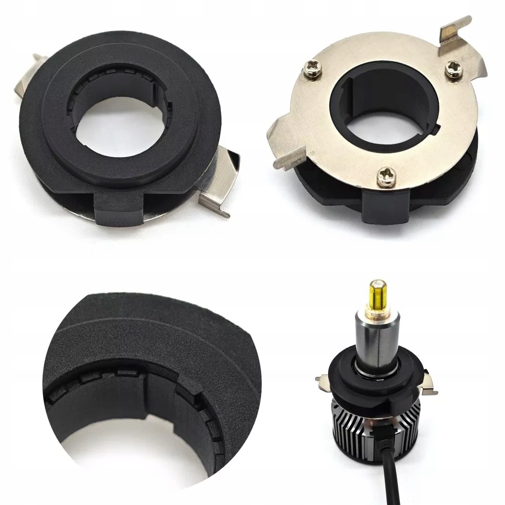 Адаптер останнього покоління. Знімаємо хомут світлодіодної лампи H7 і встановлюємо цей адаптер замість хомута.Адаптер також містить хомут світлодіодної лампи H7 і перехідник, який кріпить світлодіодну лампочку в світильнику.Завдяки цьому рішенню установка світлодіода лампи в лампі так само просто, як встановити скляну лампу H7. Адаптери старішого покоління вимагали терпіння під час встановлення світлодіодної лампи, а іноді це було неможливо.