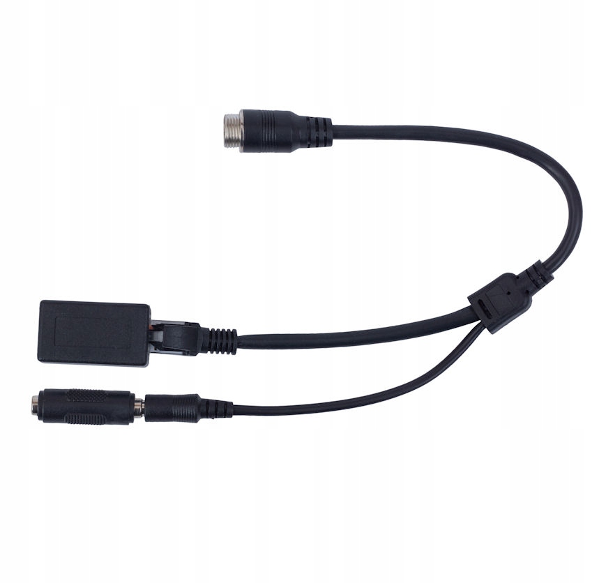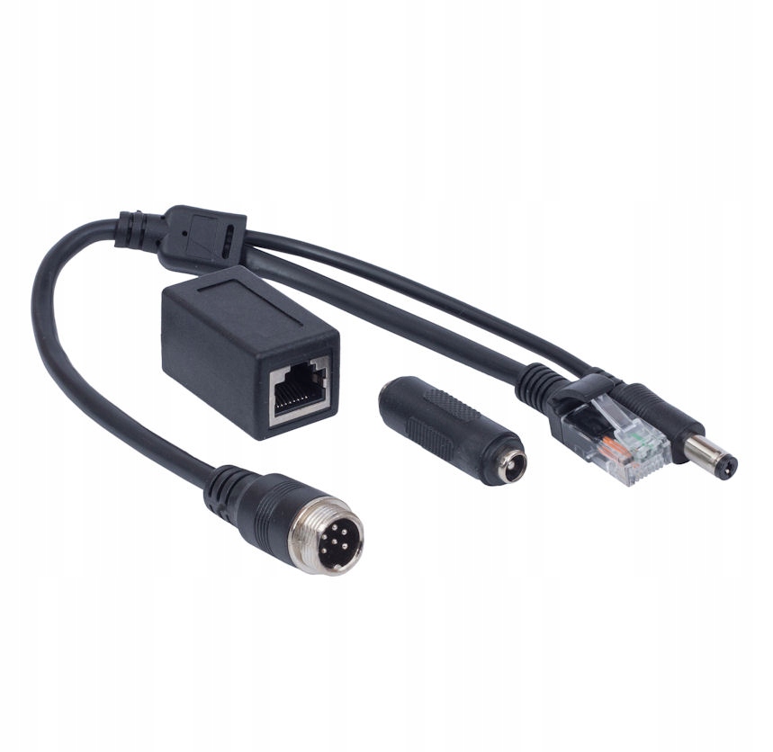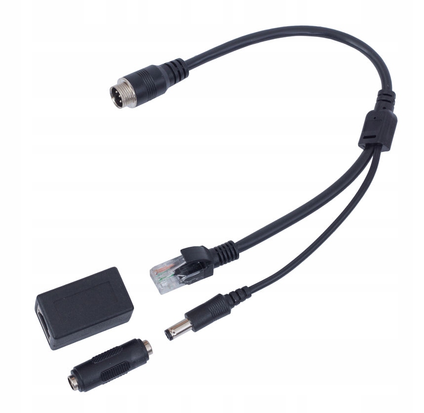 Кабель з'єднання закінчився з одного боку 6-контактною пробкою M12, а з іншого-вилкою або розеткою RJ-45, а також розеткою для вилки або живлення 2.1/5,5 мм (в комплекті з адаптерами).