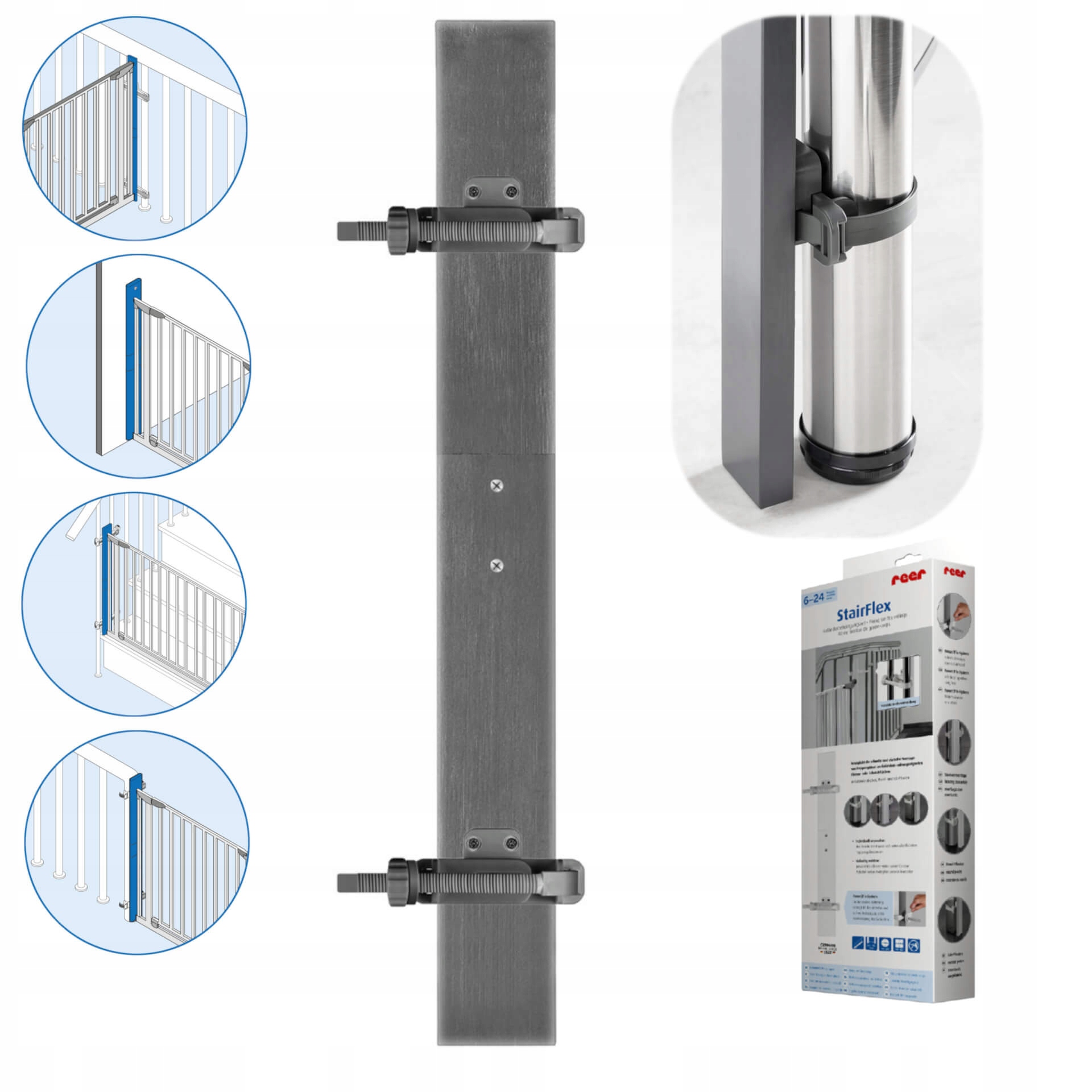 - Цей продукт дозволяє швидко і легке кріплення захисних воріт (як розширювальних, так і гвинтових) до балюстрад, коли немає поверхні для належного встановлення.