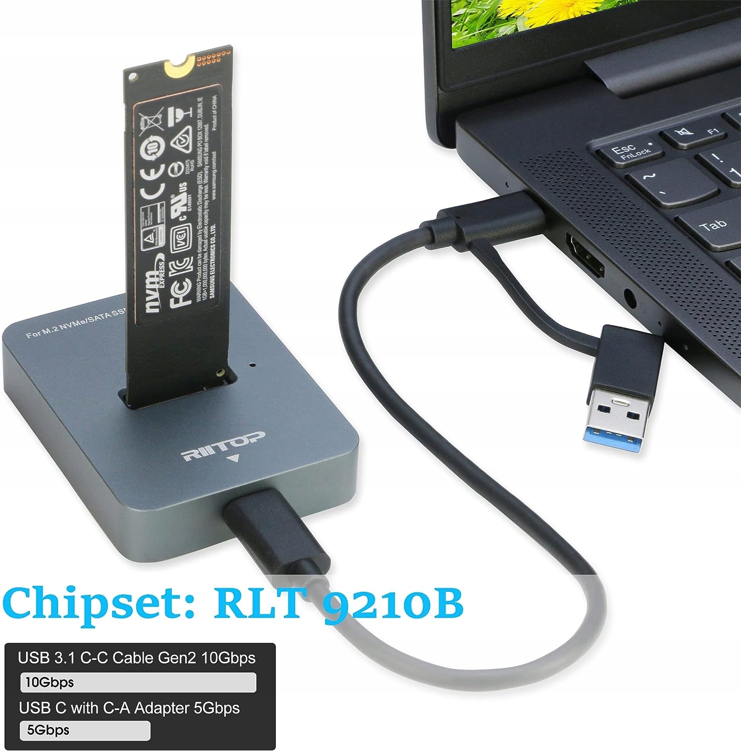 - Ця док-станція RIITOP M.2 є не лише адаптером NVMe до USB, але також працює з M.2 (ключ B+M) M.2 SSD M.2 із SATA. Він призначений для тих, у кого є кілька SSD-накопичувачів M.2 NVMe або SSD з каналом SATA, які потрібно часто підключати та від’єднувати. Монтажні гвинти не потрібні, просто вставте свій пристрій M.2 і під’єднайте кабель USB-C, і ви відразу зможете використовувати його як зовнішній SSD