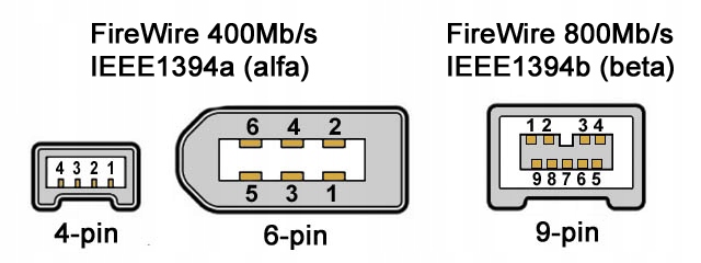 Стандарт FireWire використовує три типи роз’ємів: 4P, 6P і 9P. Стандарт IEEE 1934a, що забезпечує передачу 400 Мбіт/с, використовує штекери 4P і 6P (називаються альфа-штекерами), стандарт IEEE 1394b, що забезпечує передачу 800 Мбіт/с, потребує штекера 9P (називається бета-версією) і використовувався в деяких моделях комп’ютерів (наприклад, PowerBook від компанії Apple). ).