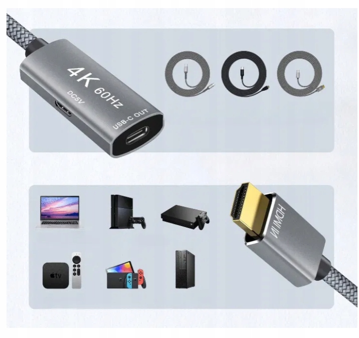 - HDMI (штекер) → USB-C: Дозволяє перетворювати сигнал HDMI на пристрої з портом USB-C.