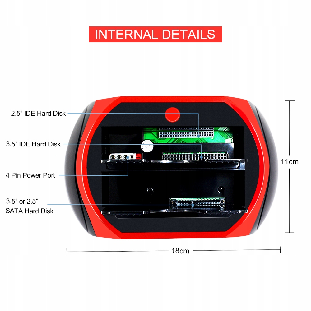 - Підтримує 2,5-дюймові та 3,5-дюймові жорсткі диски SATA та IDE Підтримує гаряче підключення та може розбирати жорсткий диск без інструментів
