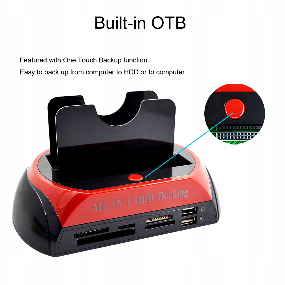 Док-станція ALL IN ONE для дисків і пристроїв запису даних з функцією OTB (One Touch Backup) і пропускною здатністю до 480 Мбіт/с.