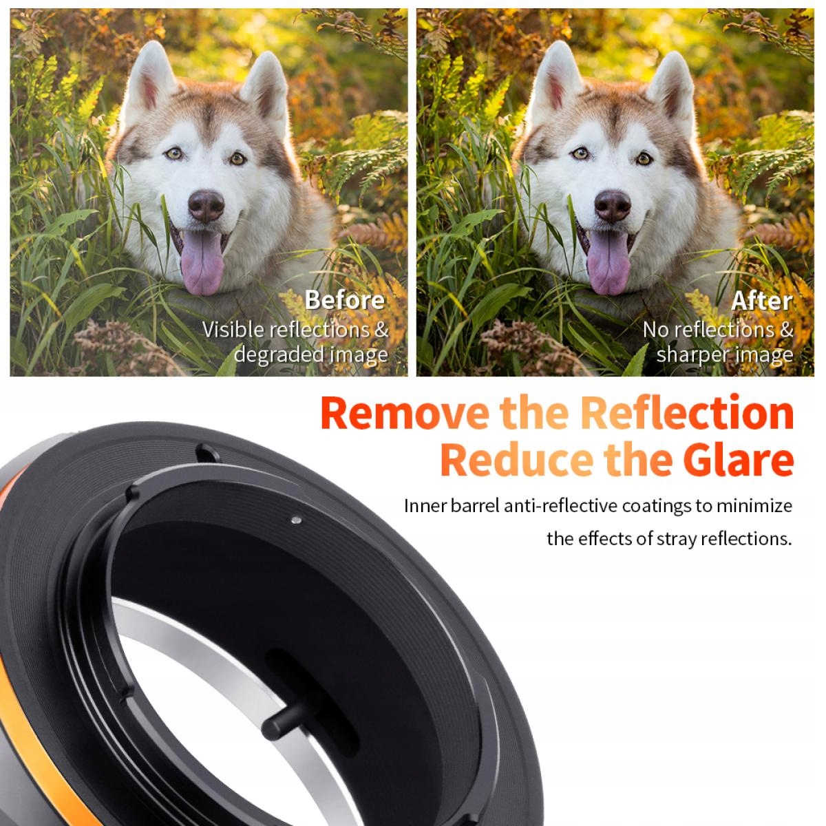 Внутрішня частина адаптера має спеціальне матове покриття, яке мінімізує ризик відблисків і відблисків. Що впливає на контрастність отриманої фотографії та різкість. Наведені вище фотографії ілюструють це.