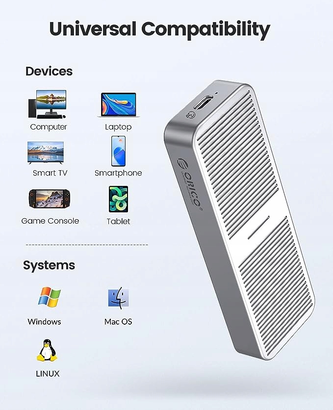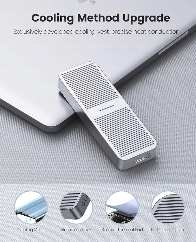 Відведення тепла: після оптимізації та оновлення корпус M.2 SSD отримує унікальне охолодження жилет з металу ORICO з довгою теплопровідною силіконовою накладкою, яка оточує SSD у всіх напрямках і ретельно розсіює тепло. Ефективність розсіювання тепла на 20–30% вища, ніж у звичайних футлярів M.2-Solid-State-Drive.