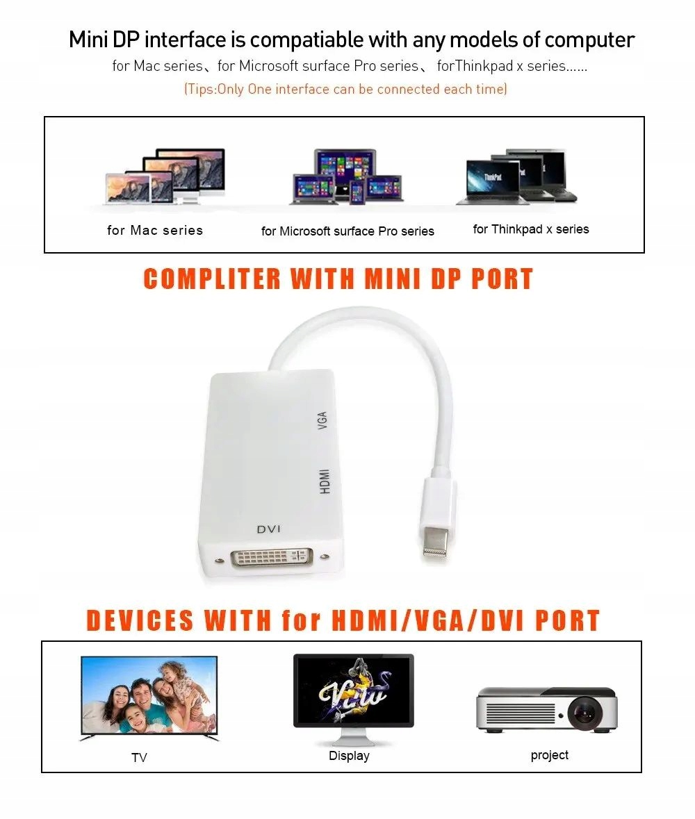 • Функція 3 в 1:Цей адаптер mini DP DisplayPort на HDMI/DVI/VGA універсальний інструмент, який дозволяє підключати Apple MacBook Air Pro MDP до різних пристроїв за допомогою одного кабелю.