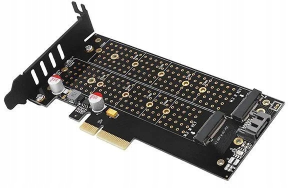 Адаптер підтримує використання дисків SATA та NVME (PCI-Express) SSD M.2, однобічного та двостороннього. Зниження не має обмеження продуктивності SSD, і ви можете використовувати M.2 картки до всіх розмірів до 110 мм завдовжки. Це очевидно для діяльності обох дисків одночасно.
