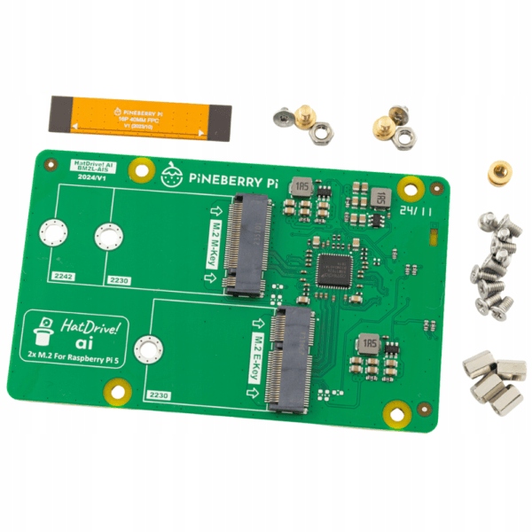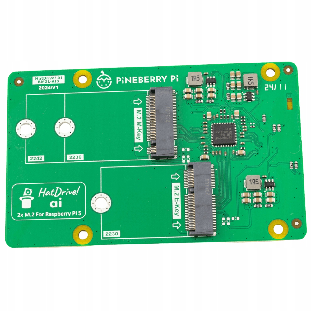 Розширте свій Raspberry Pi 5 потужними можливостями штучного інтелекту за допомогою адаптера Pineberry Pi HatDrive! ШІ. Цей інноваційний адаптер PCIe дозволяє інтегрувати диски NVMeрозмірів 2230/2242 і прискорювач Google Coral AI за допомогою лише одного HAT.