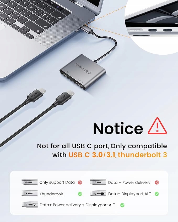- Адаптер HDMI для 2 моніторів: за допомогою концентратора Avedio Links USB-C до HDMI 2-в-1 ви можете легко розширити можливості підключення свого ноутбука за допомогою 2 портів 4K HDmi. За допомогою цього розгалужувача USB-C до HDMI 1 в 2 ви можете підключити 2 монітори до ноутбука чи комп’ютера, щоб насолоджуватися комфортом розширеного або дзеркального дисплея. Цей перетворювач USB-C у HDMI виготовлено з алюмінієвого сплаву та має мініатюрні розміри, що робить його дуже міцним і портативним.